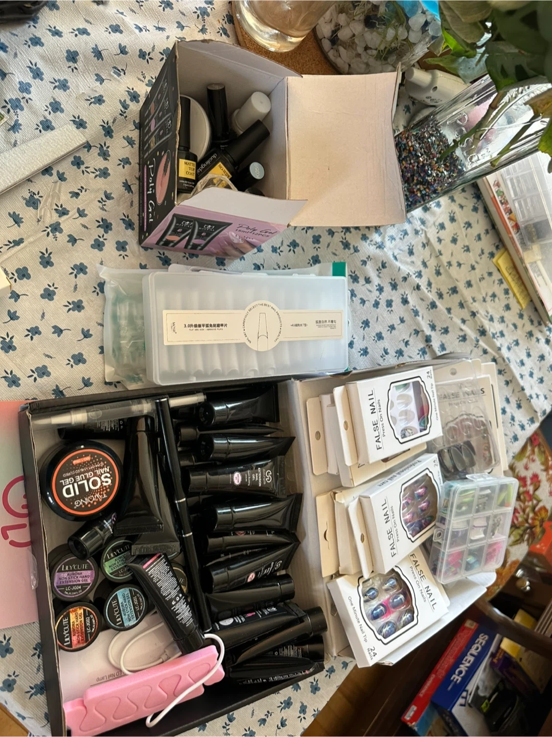 This kit contains polygel tubes, false nails, nail glue gel, and other nail art accessories. Includes various shades of extension gel and nail art decorations. Great for DIY nail extensions and designs!