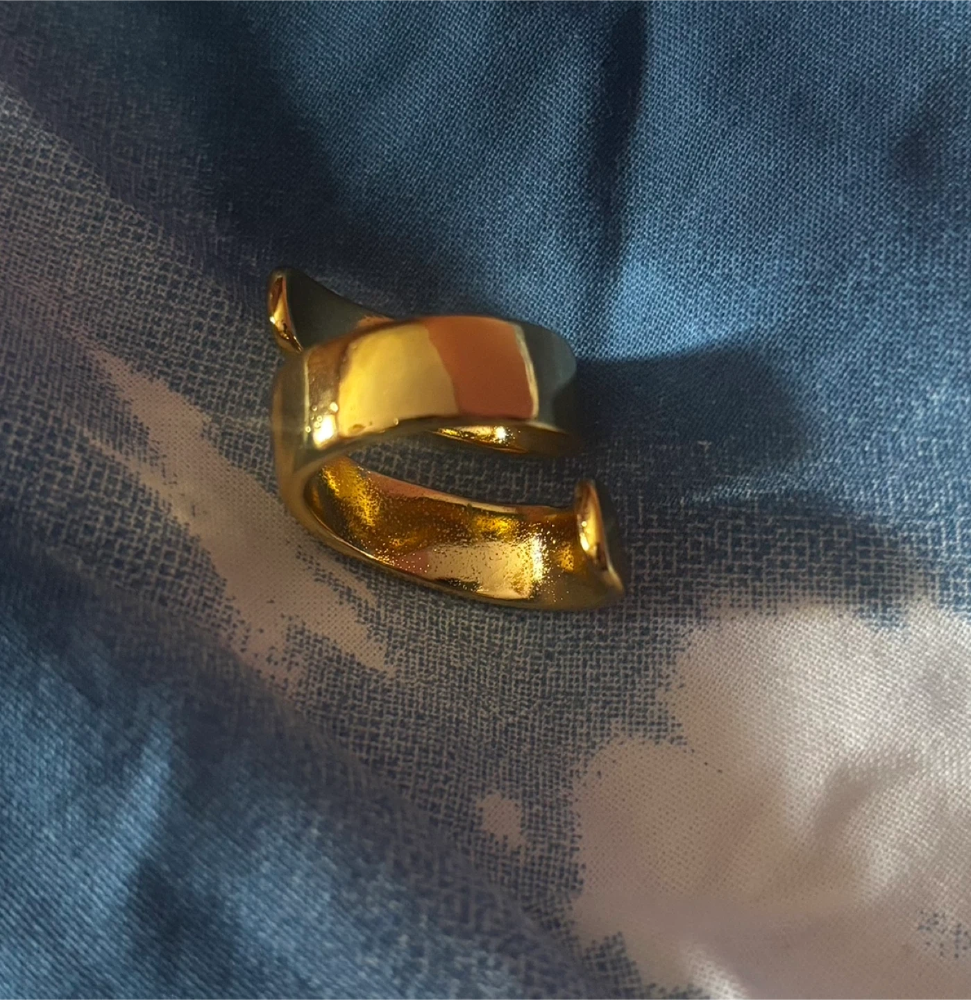 This is a shiny gold tone ring with a unique swirl design. It's a statement piece that adds a touch of elegance. The metal appears to be a gold-tone alloy.