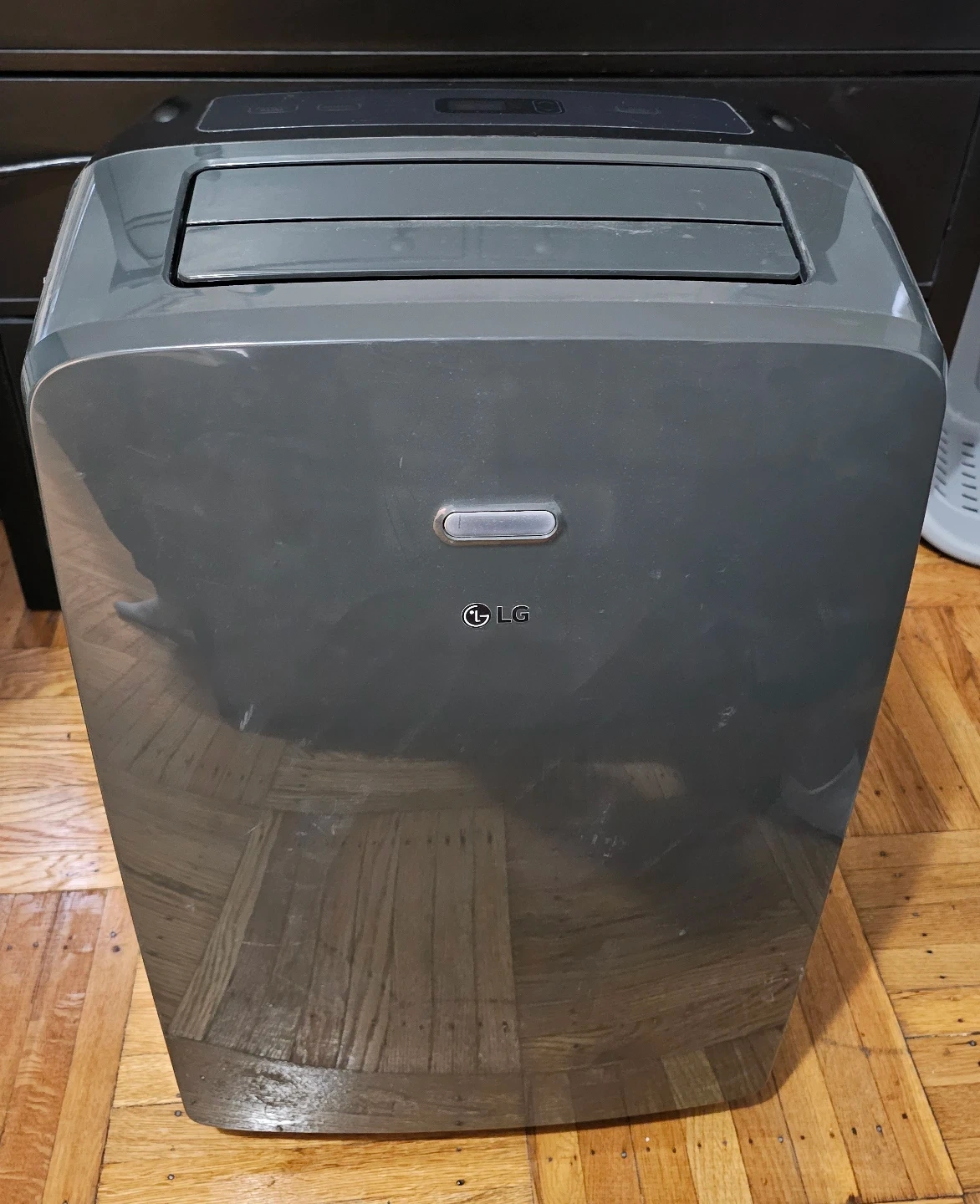 This is a grey LG portable air conditioner. It's a great unit for keeping a room cool. It comes with adjustable vents on top. Also includes flexible airhose and windows fittings.