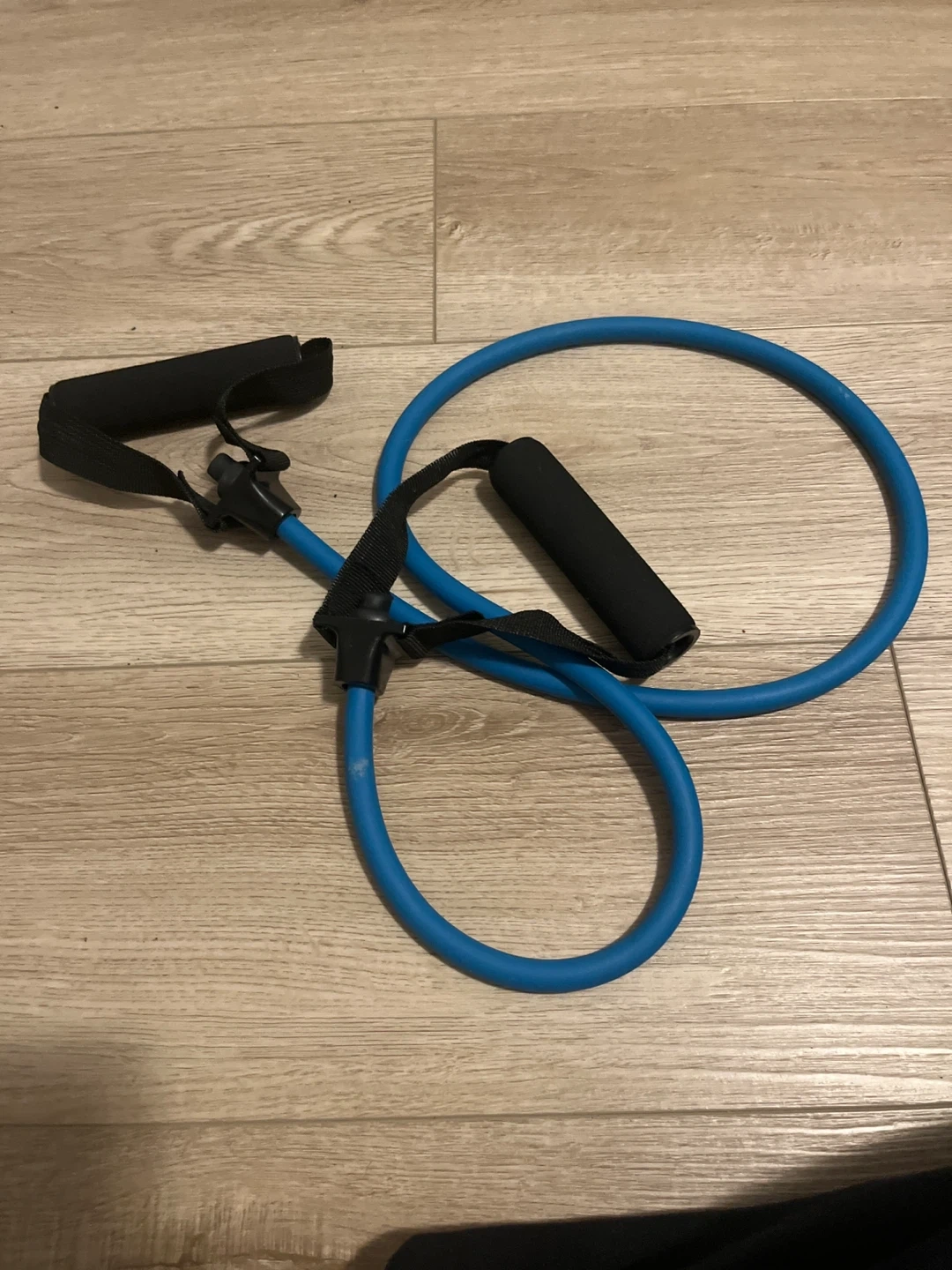 This blue resistance band comes with two foam handles for a comfortable grip. It's suitable for a variety of exercises. This band is made of durable elastic material.