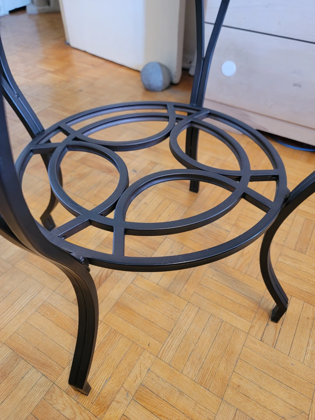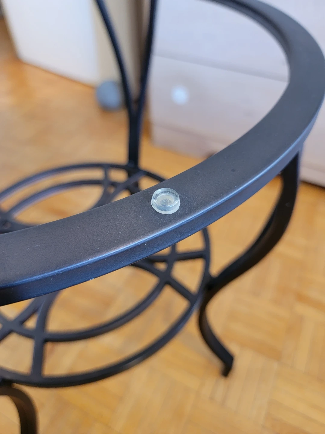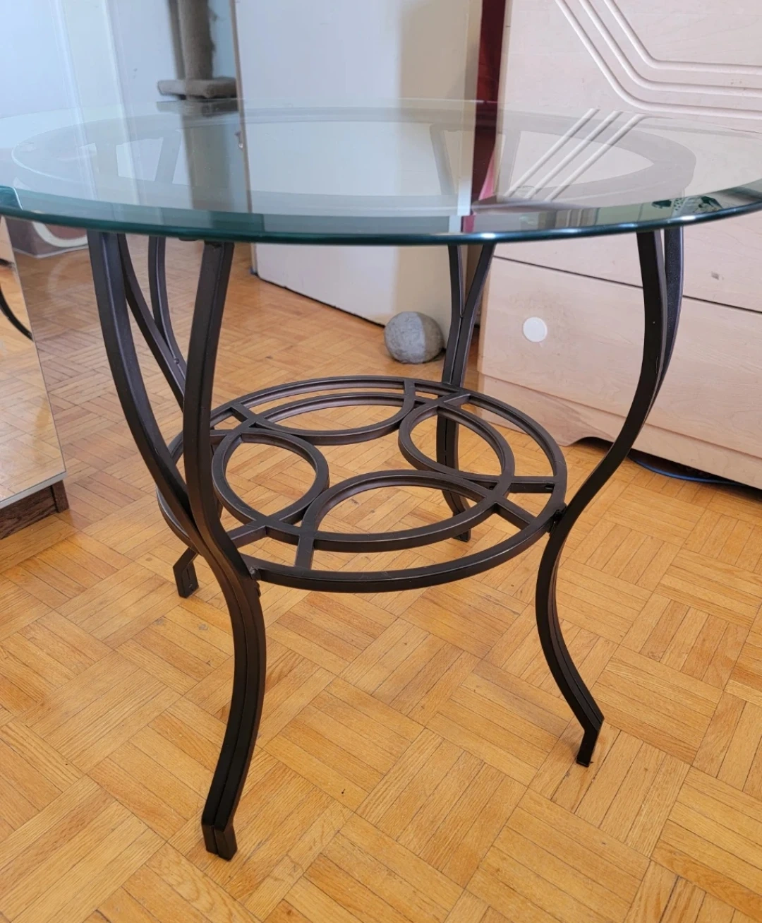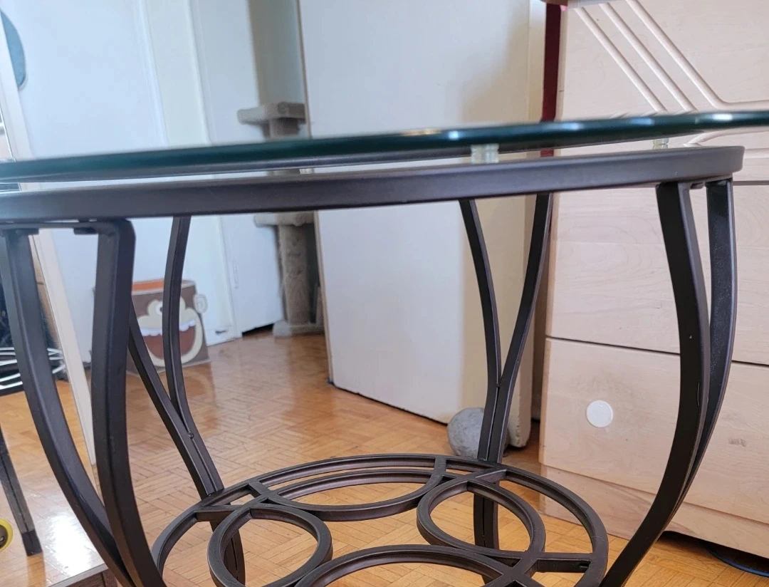 I'm selling this charming round side/coffee table. It has a clear glass top and a sturdy dark brown metal base with decorative details.