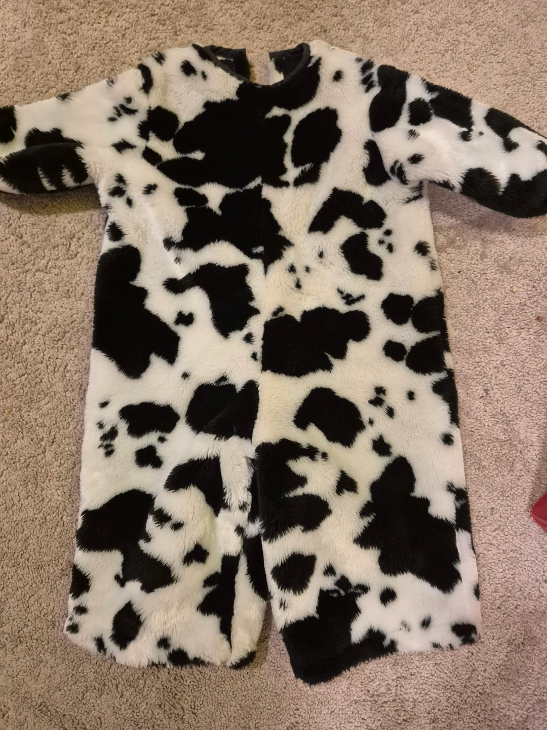 Super soft and cozy cow print onesie with faux fur material. It's perfect for Halloween or just lounging around the house! This onesie is designed for comfort and fun.