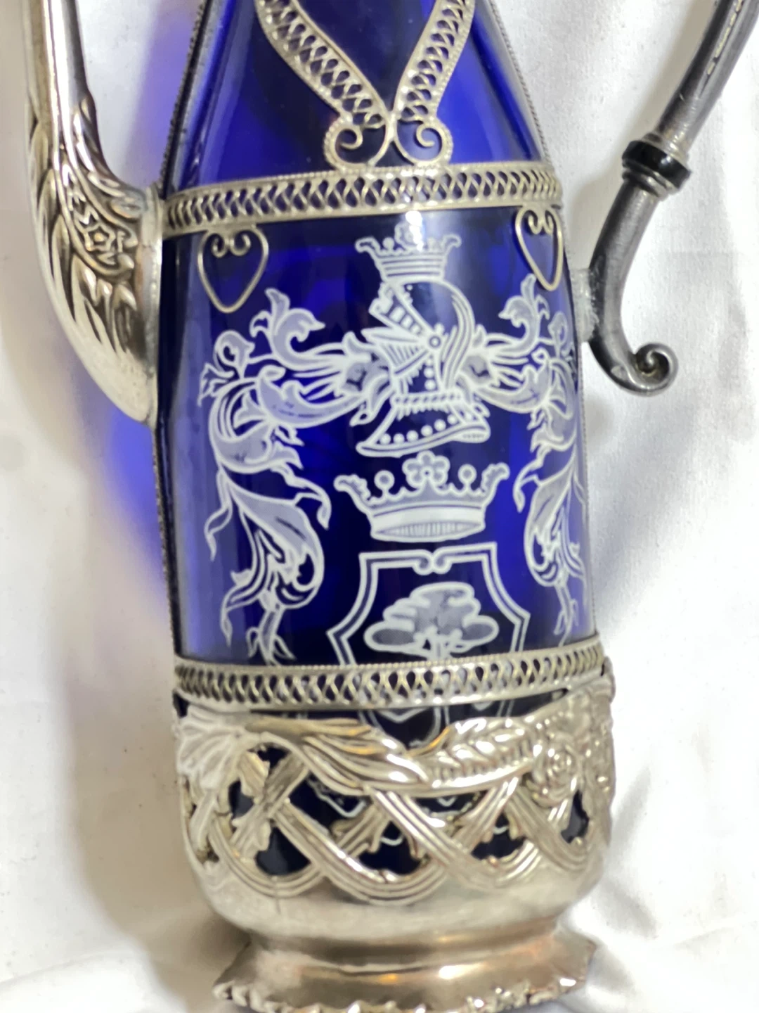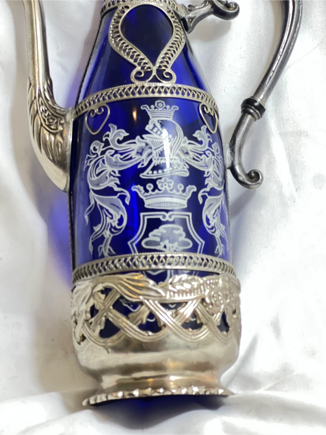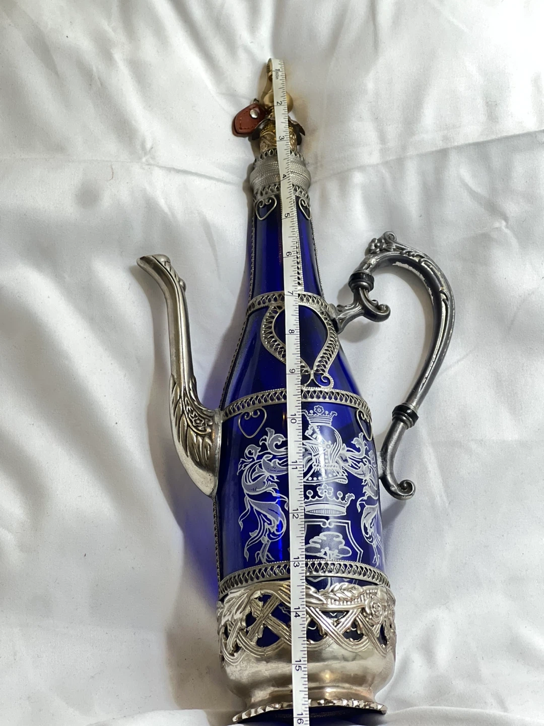 A decorative blue glass pitcher with ornate metal accents. It's designed with intricate detailing and a pouring spout. This pitcher would make a striking decorative piece.