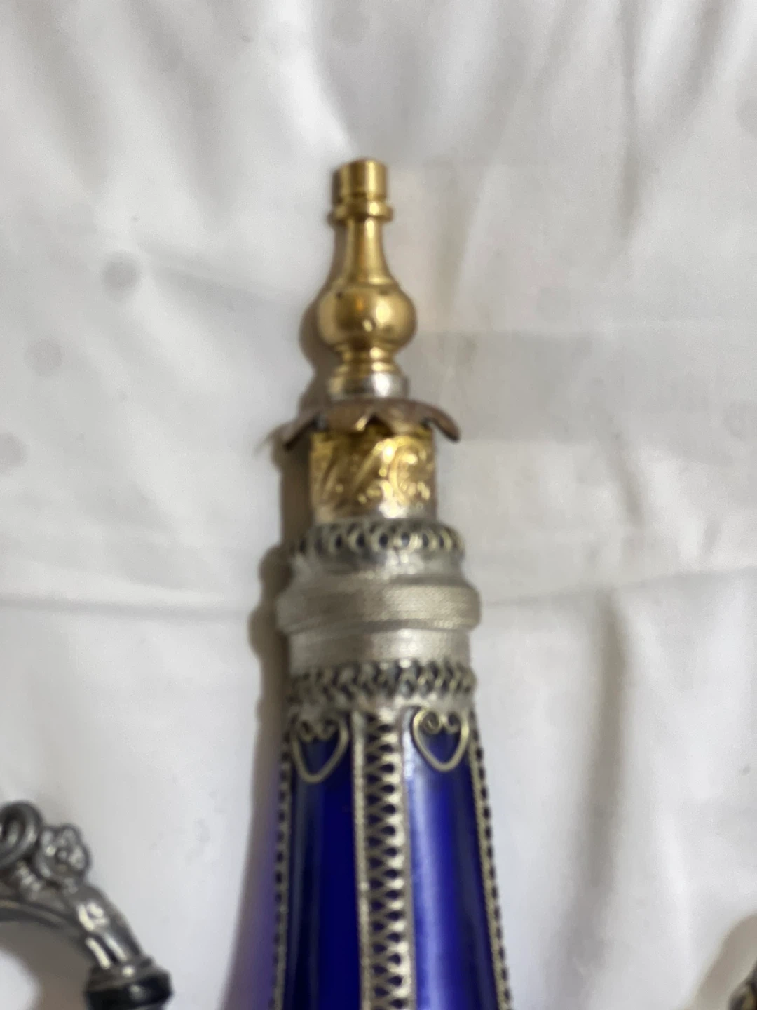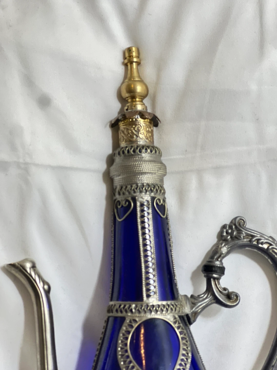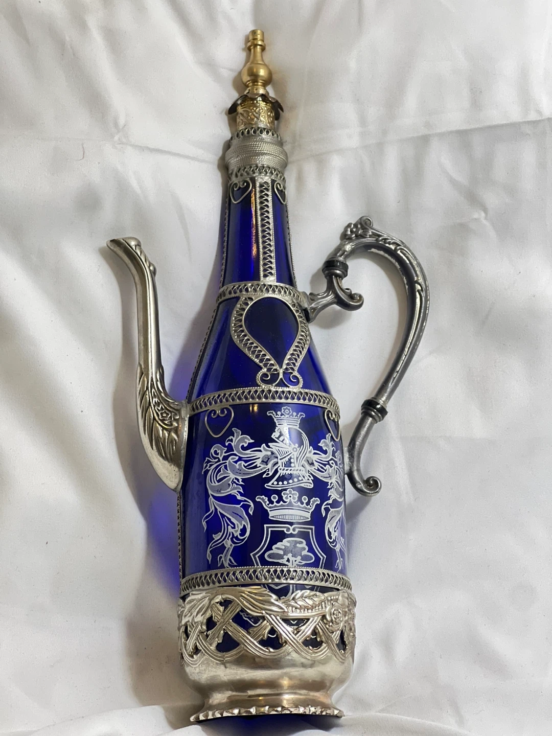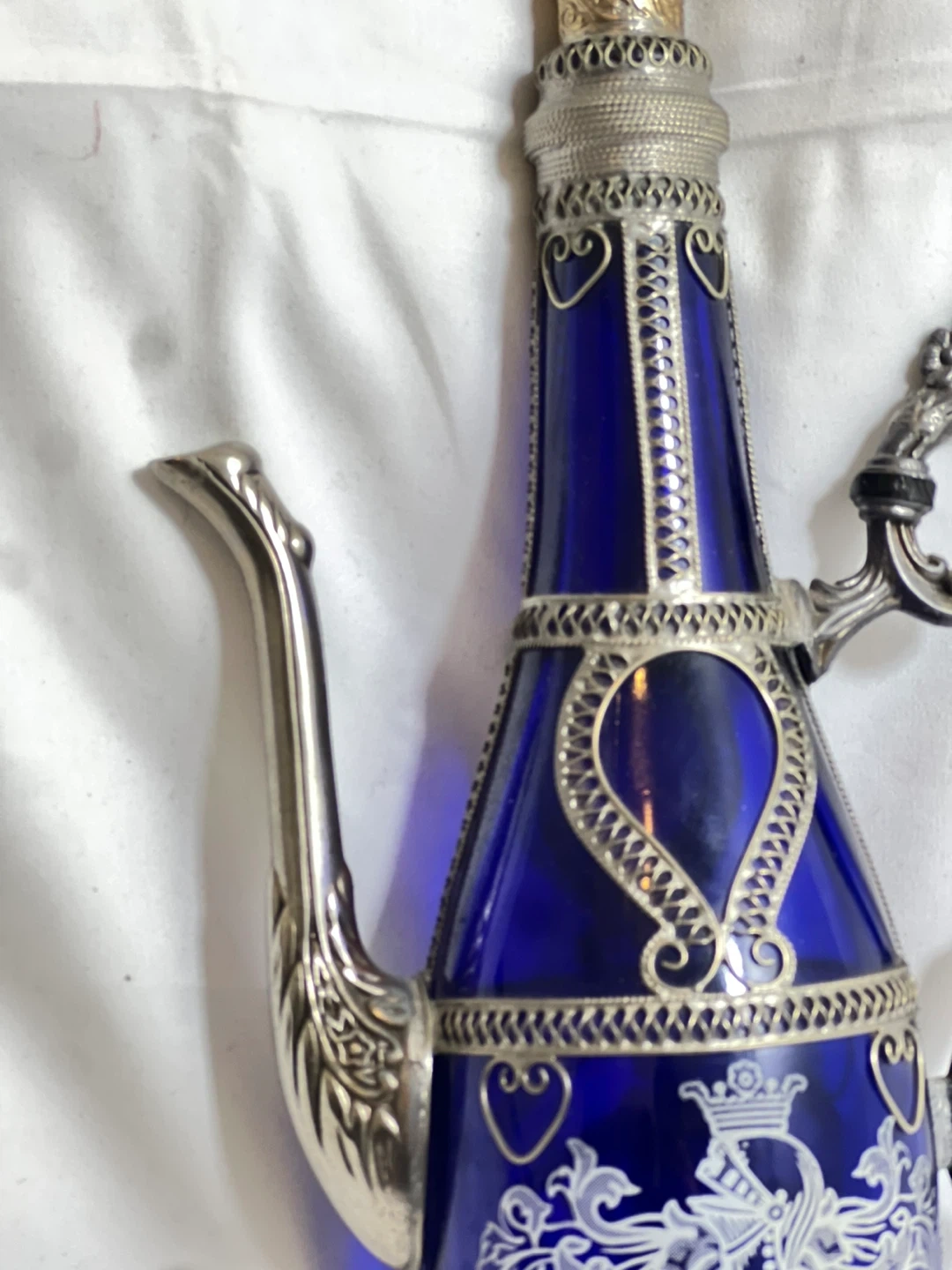 A decorative blue glass pitcher with ornate metal accents. It's designed with intricate detailing and a pouring spout. This pitcher would make a striking decorative piece.