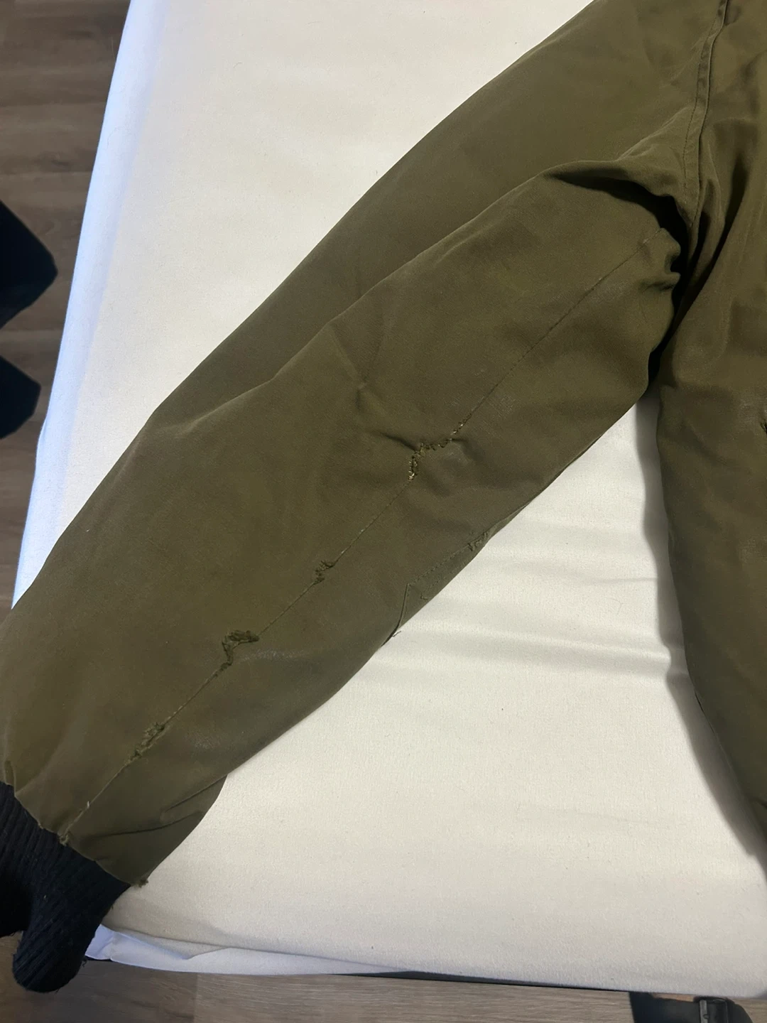 Classic Canada Goose bomber jacket in olive green. Features a fur-lined hood and durable construction. Some minor wear is visible on the sleeves. It's a great jacket for cold weather!