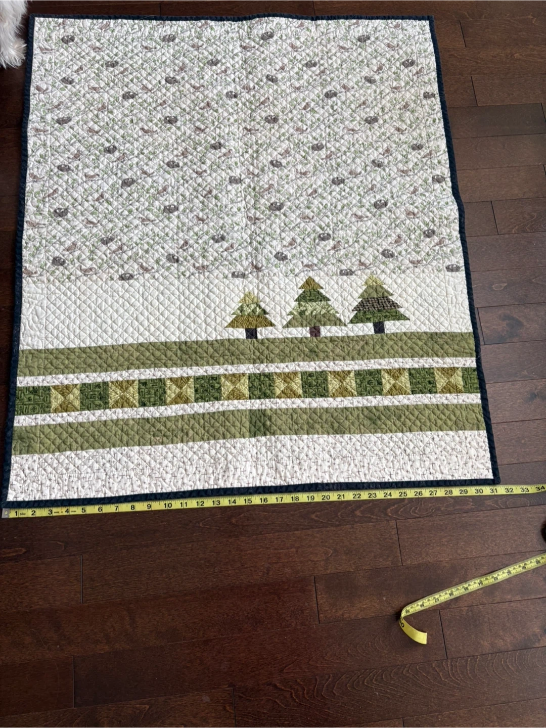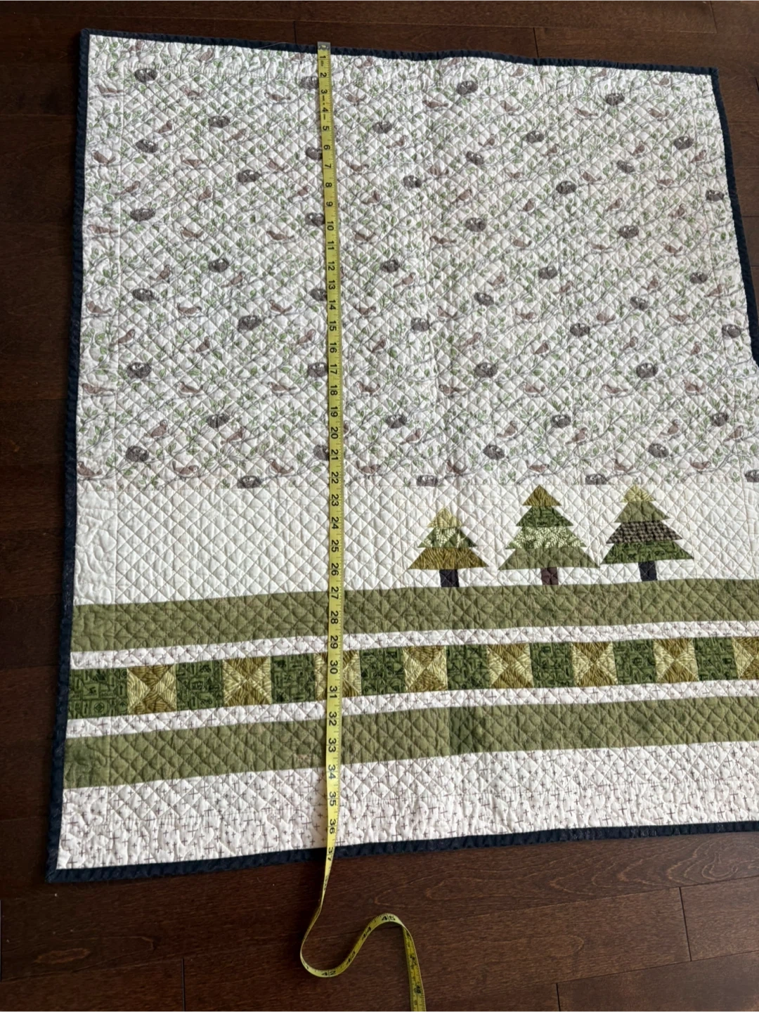 This beautiful handmade quilted throw blanket features a charming woodland theme with trees and birds. It's perfect for adding a cozy touch to any room. The quilt measures approximately 36 inches long.