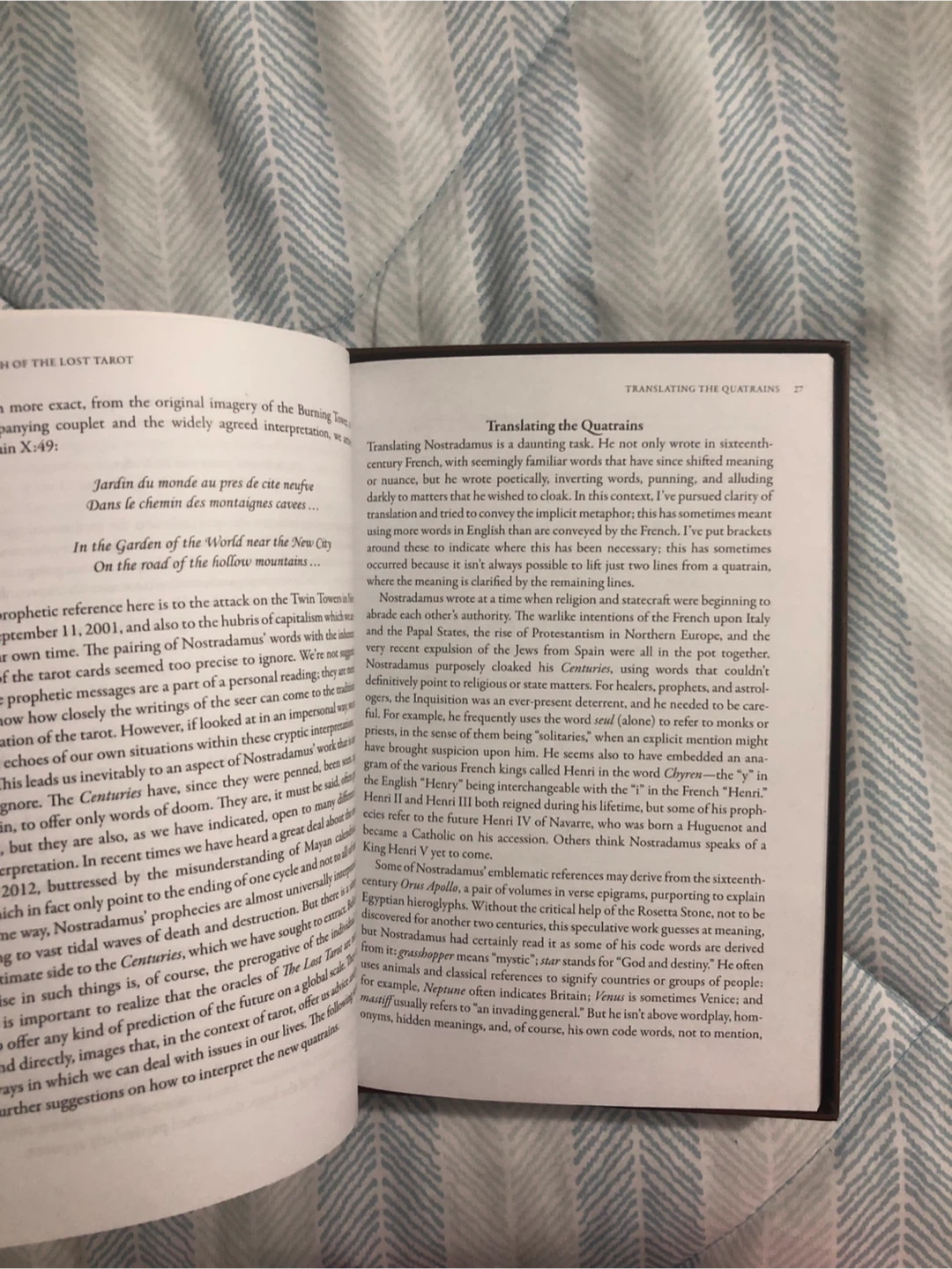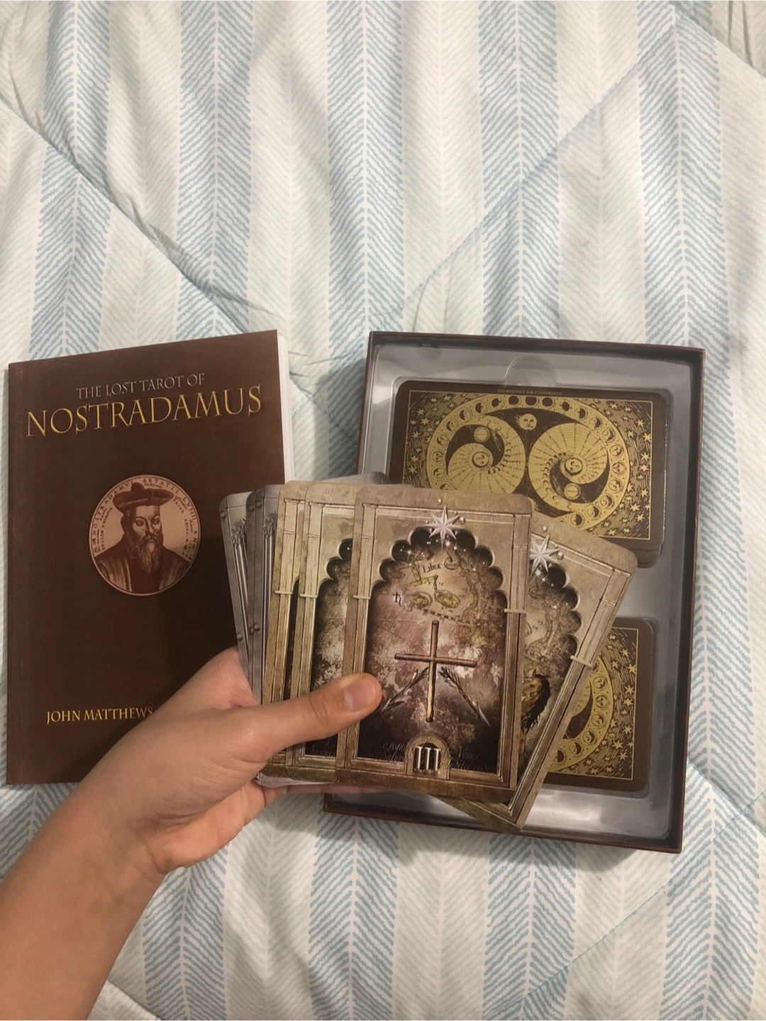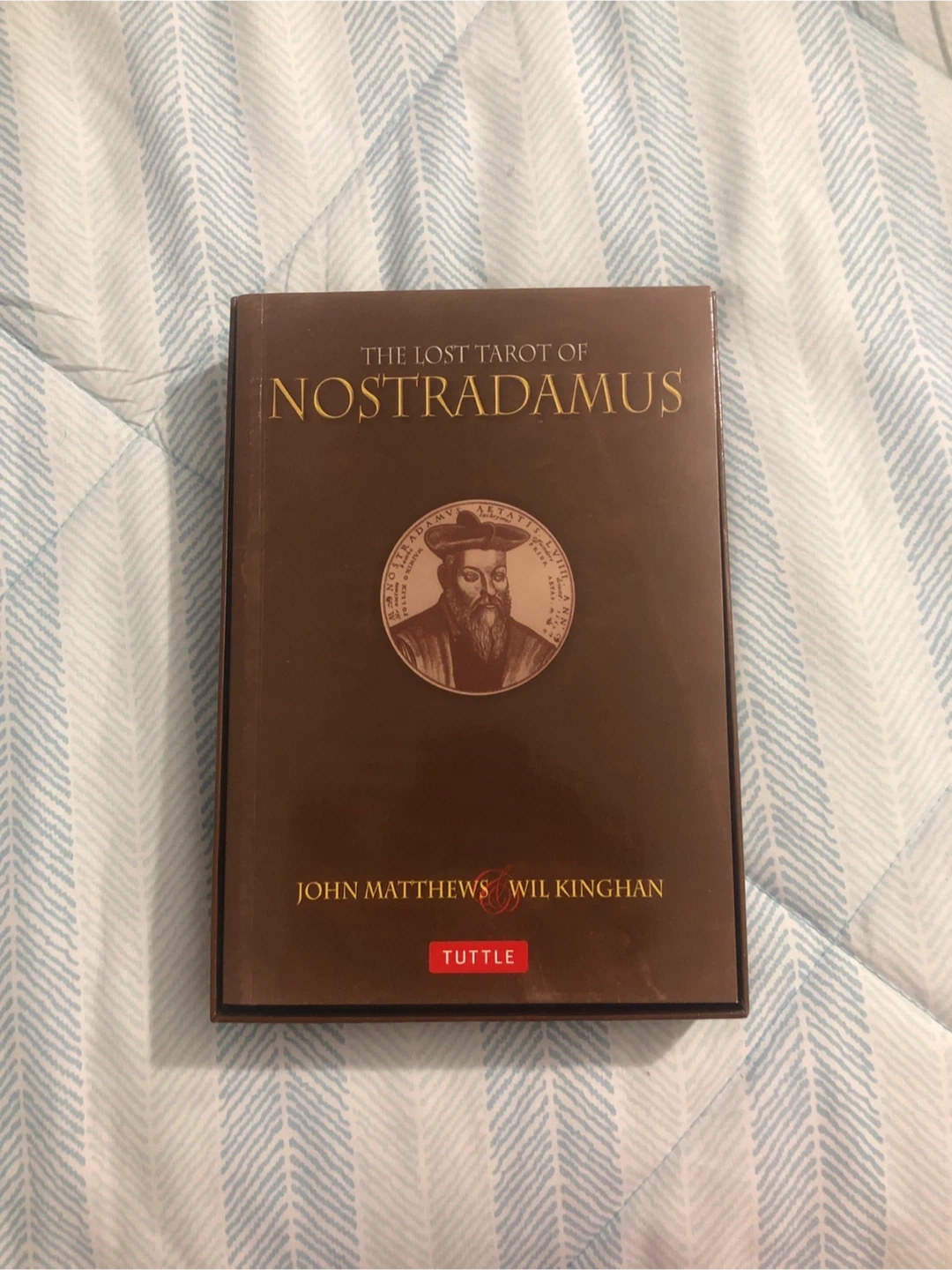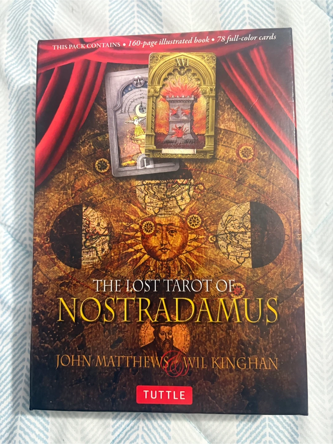 Selling The Lost Tarot of Nostradamus set by John Matthews and Wil Kinghan. This pack contains a 160-page illustrated book and 78 full-colour cards. It's in great condition and ready for a new reader!
