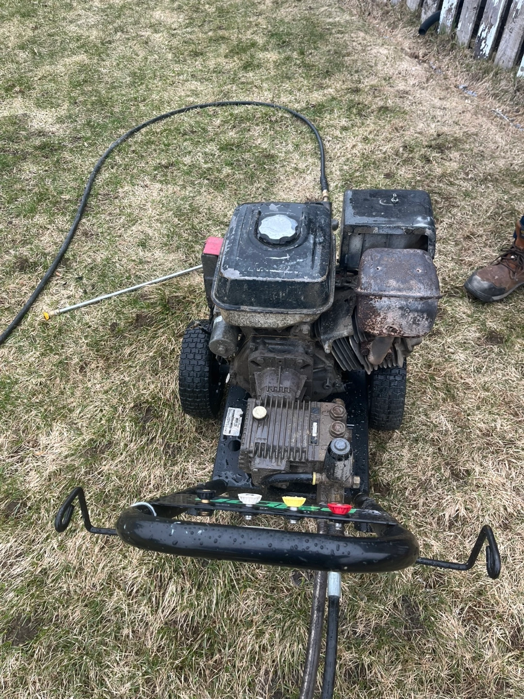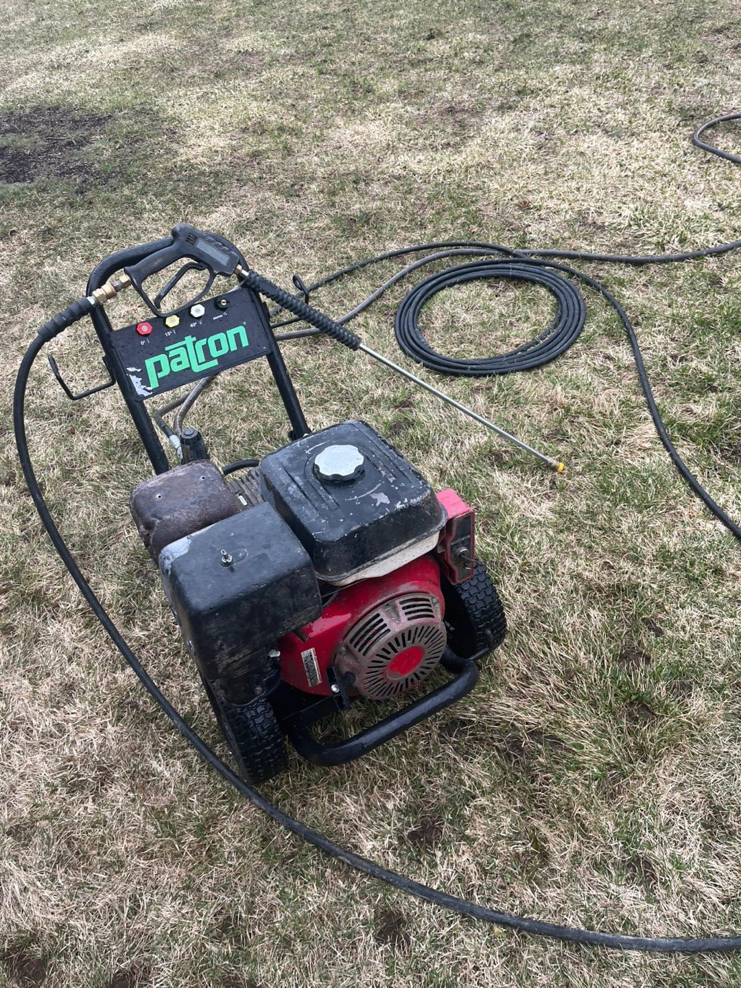 This is a used Patron gas pressure washer, perfect for tackling tough cleaning jobs around the house. It's a powerful machine with a gas engine and includes the necessary hoses and wand. Get your driveway, siding, or deck looking like new!