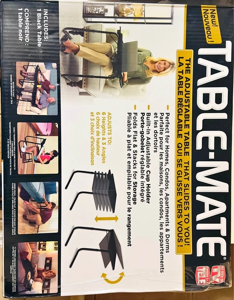Buy & SellTable mate Portable Adjustable Folding TraysTable mate Portable Adjustable Folding Trays$20Portable adjustable folding trays for eating or work, in black. Great for laptops or meals.WHERE TO MEETCheck LocationView MapSELLERAshwinHurontario161 review1 chats·1 favorites·14 viewsSEND CHAT TO SELLERHi Ashwin! I’m interested in your listing.Hi Ashwin! I’m interested in your listing.Get the Karrot app to chatSign In to chat