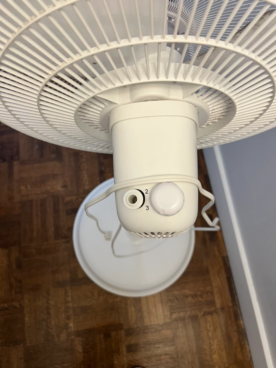 This oscillating stand fan is white. It has three speed settings controlled by a dial. Great for moving air around a room!