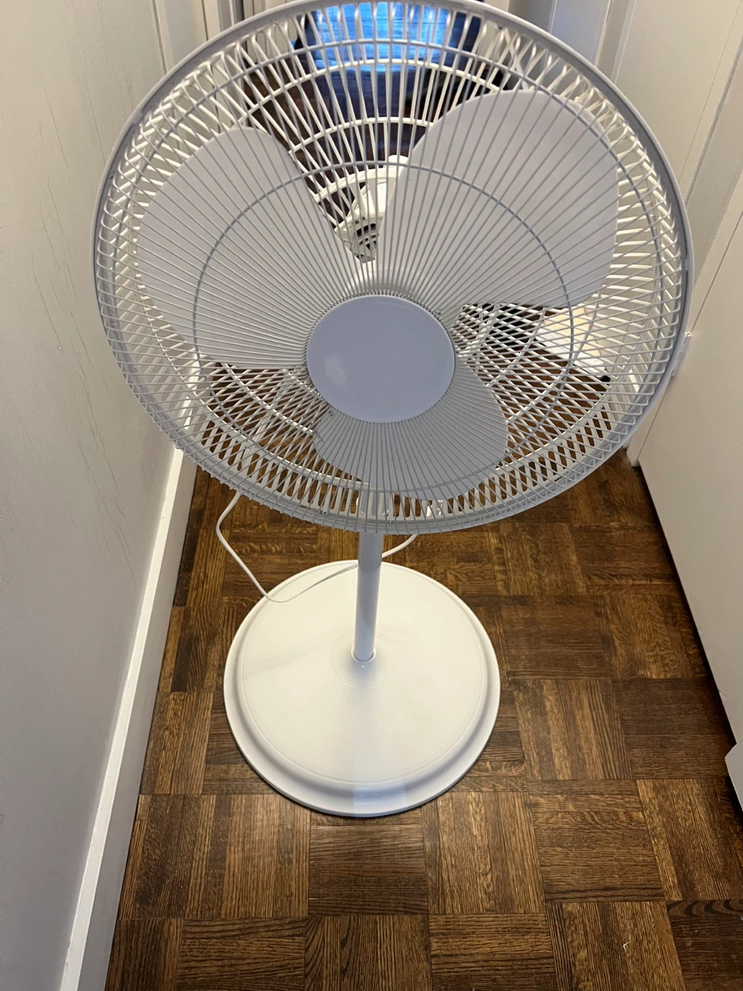 This oscillating stand fan is white. It has three speed settings controlled by a dial. Great for moving air around a room!