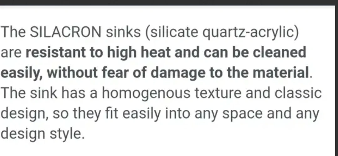 The SILACRON sinks (silicate quartz-acrylic) are resistant to high heat and can be cleaned easily, without fear of damage to the material