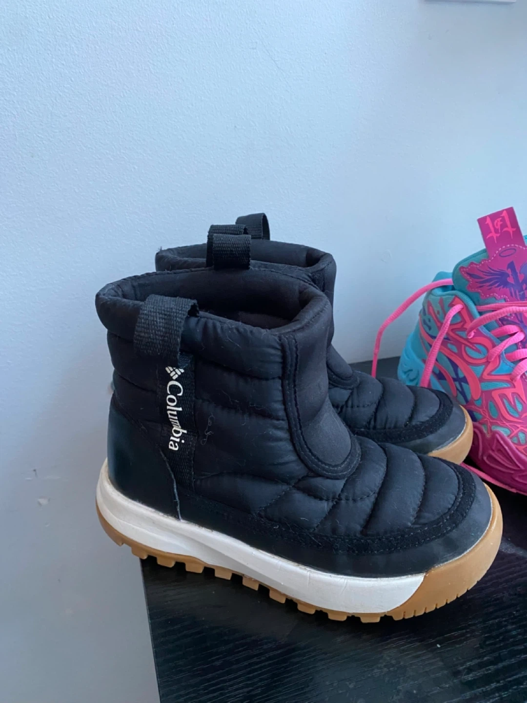 Columbia black puffer winter boots. Toddler size 13 (EUR 31, UK 12, CM 18). Easy pull-on tabs at the front and back. Rubber sole for traction.