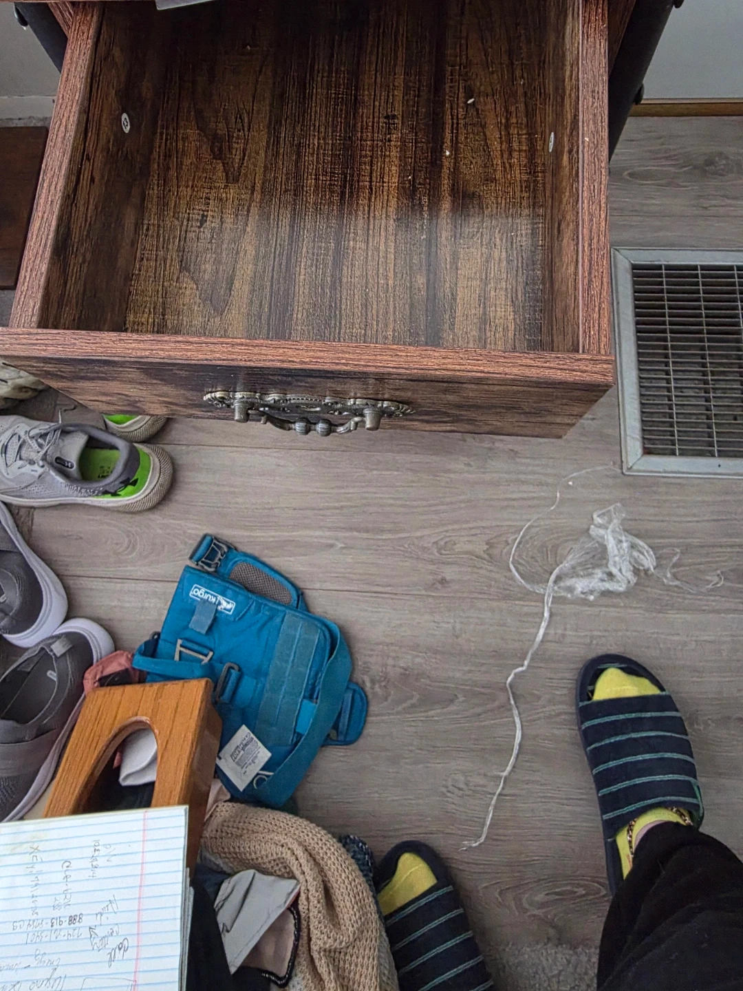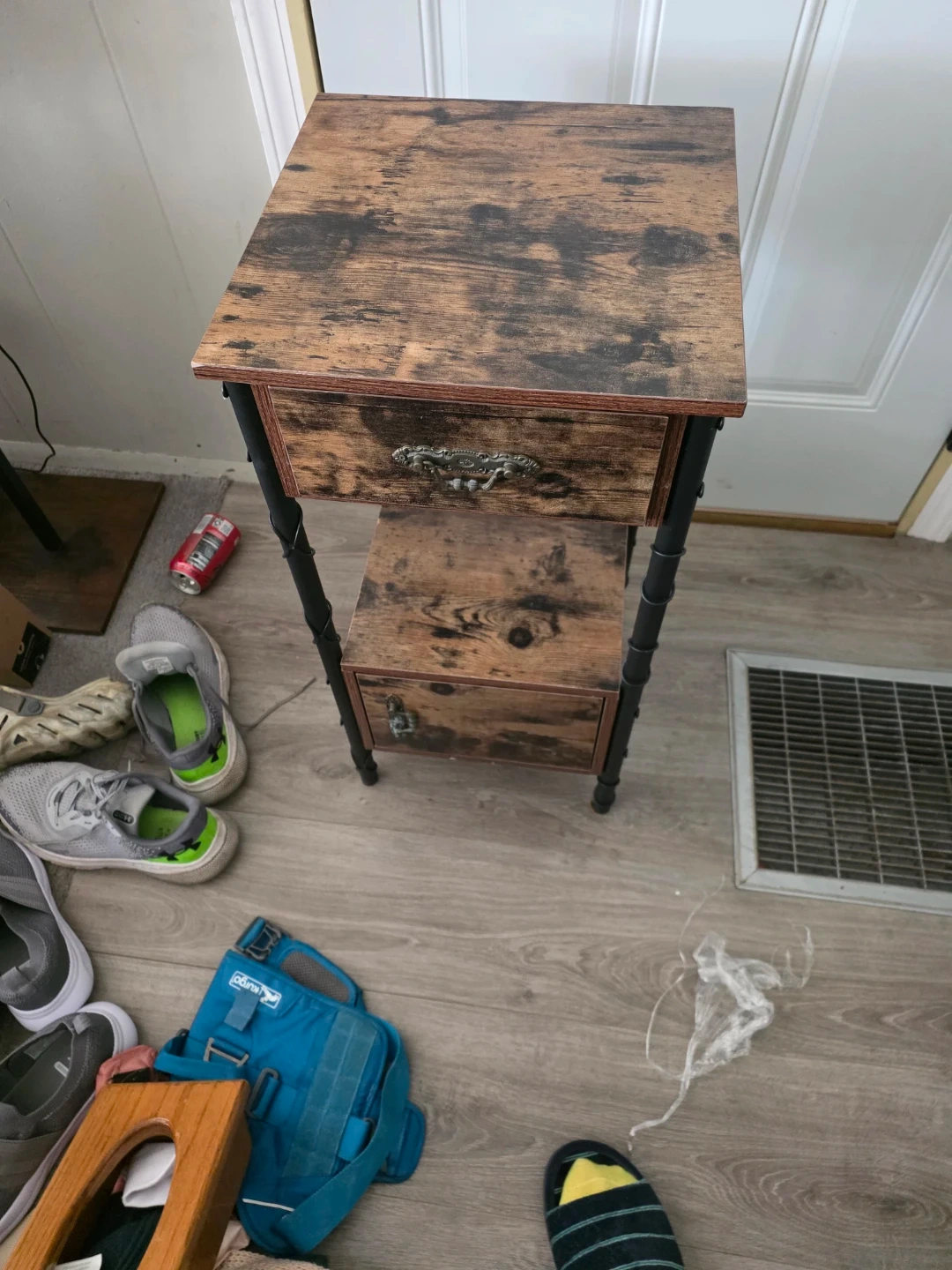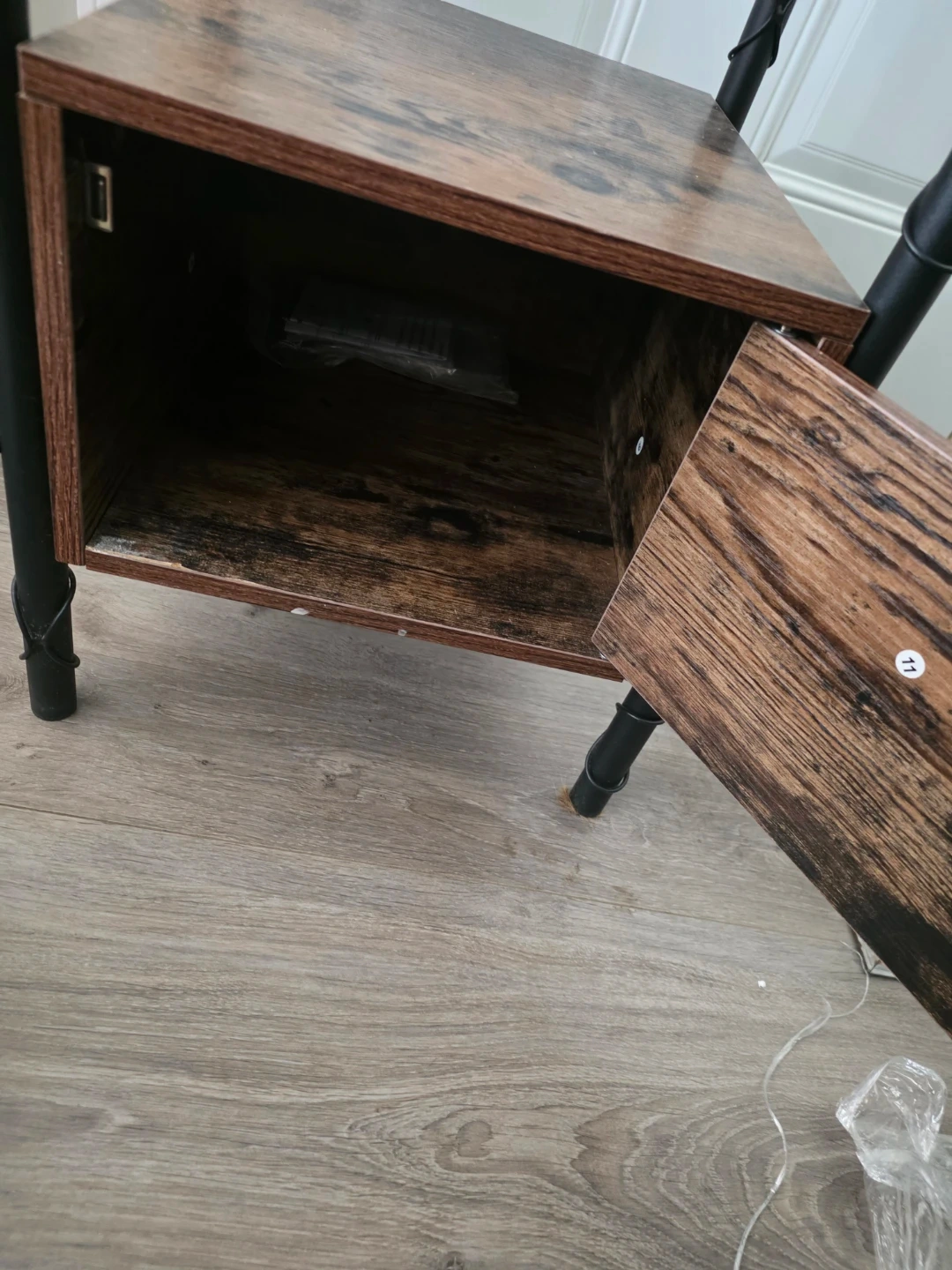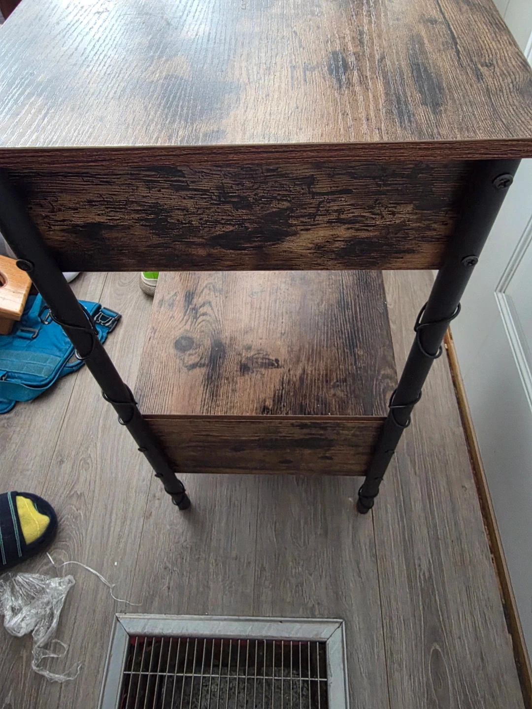 This side table features a rustic wood-look finish and black metal legs. It has one drawer on top and one below plus an open shelf below for storage. It's a compact and stylish piece for any room!