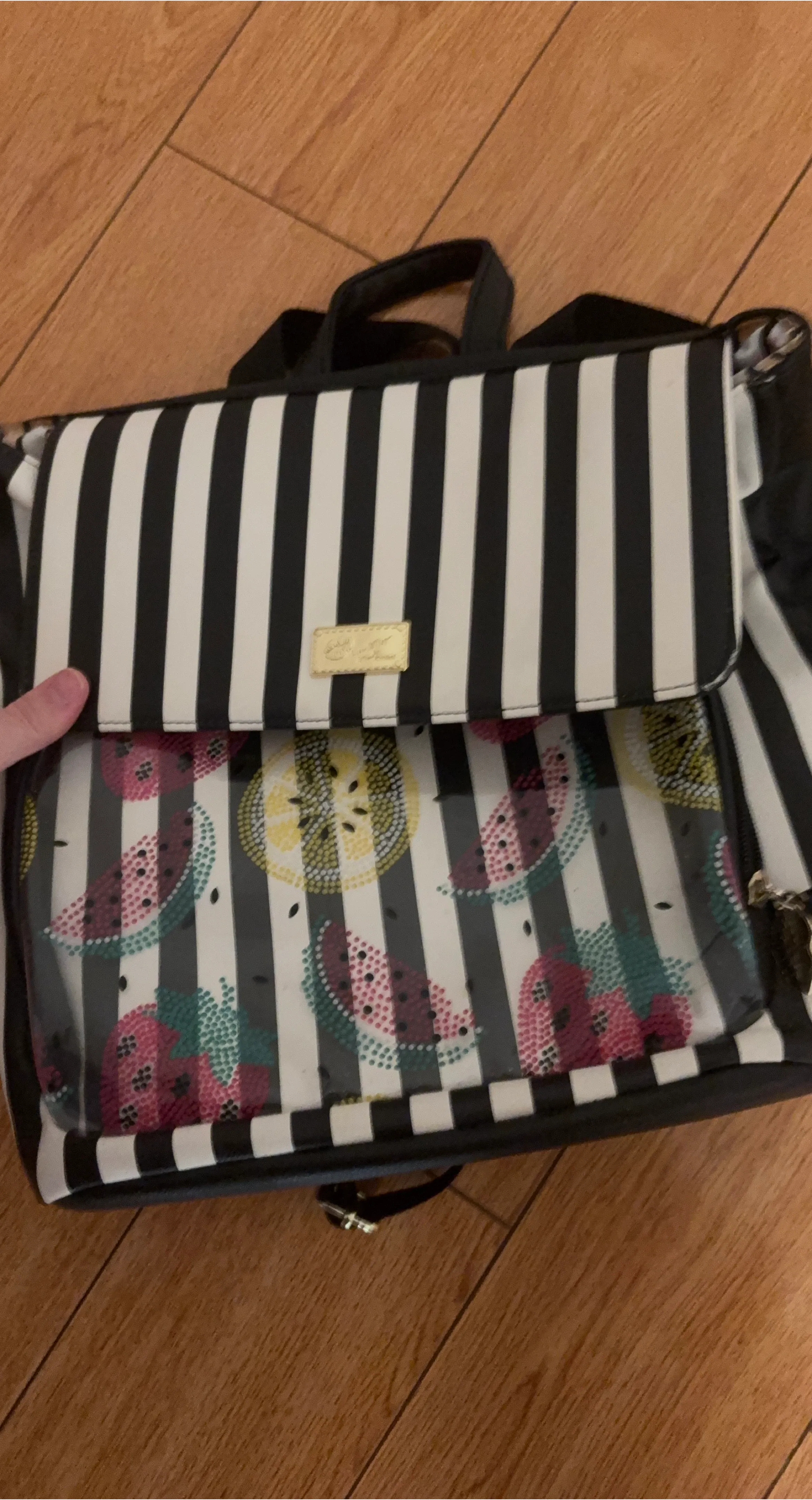 This Juicy Couture backpack features black and white stripes with a fun fruit print. It's a stylish accessory for everyday use. The material appears to be durable and easy to clean.