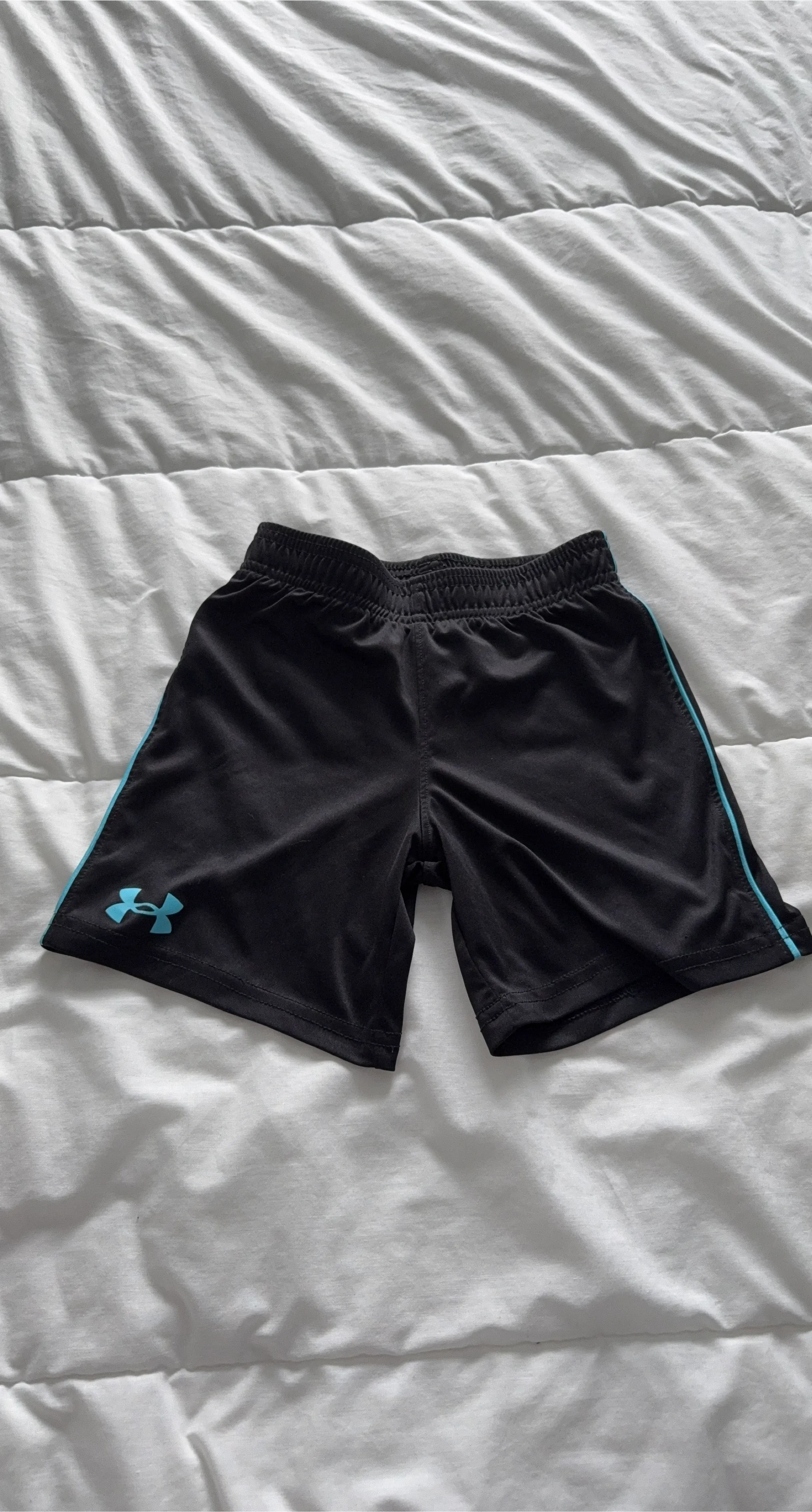 These Under Armour shorts are black with teal accents on the sides. They're made for athletic activities. Elastic waistband for a comfortable fit. 4t