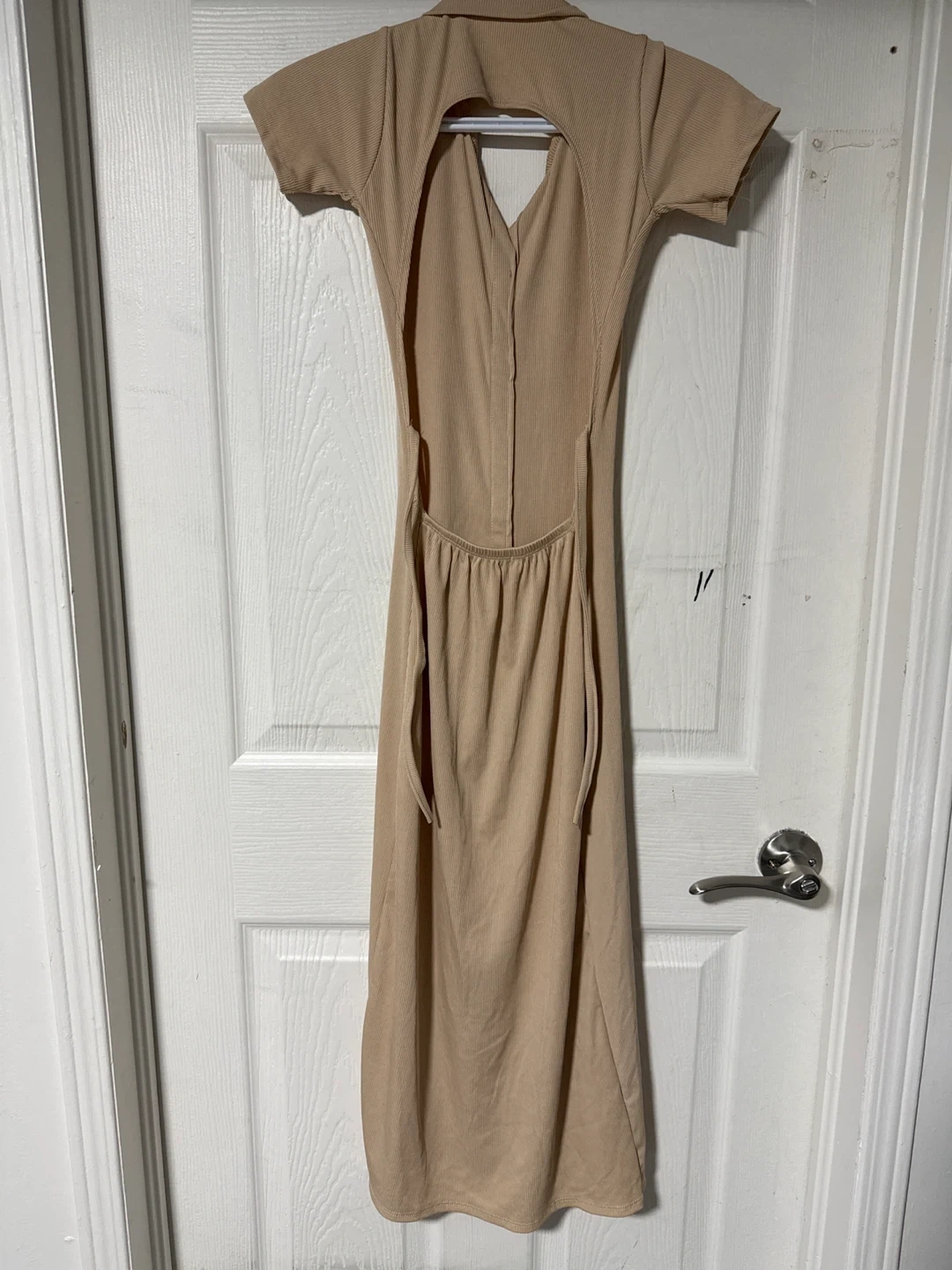 Tan ribbed button-up maxi dress. Short sleeves and a collared neckline. Features a cut-out back detail with a tie closure. Made from a comfortable stretch fabric.