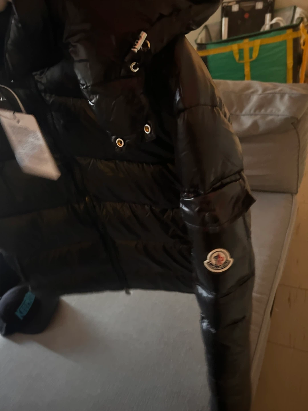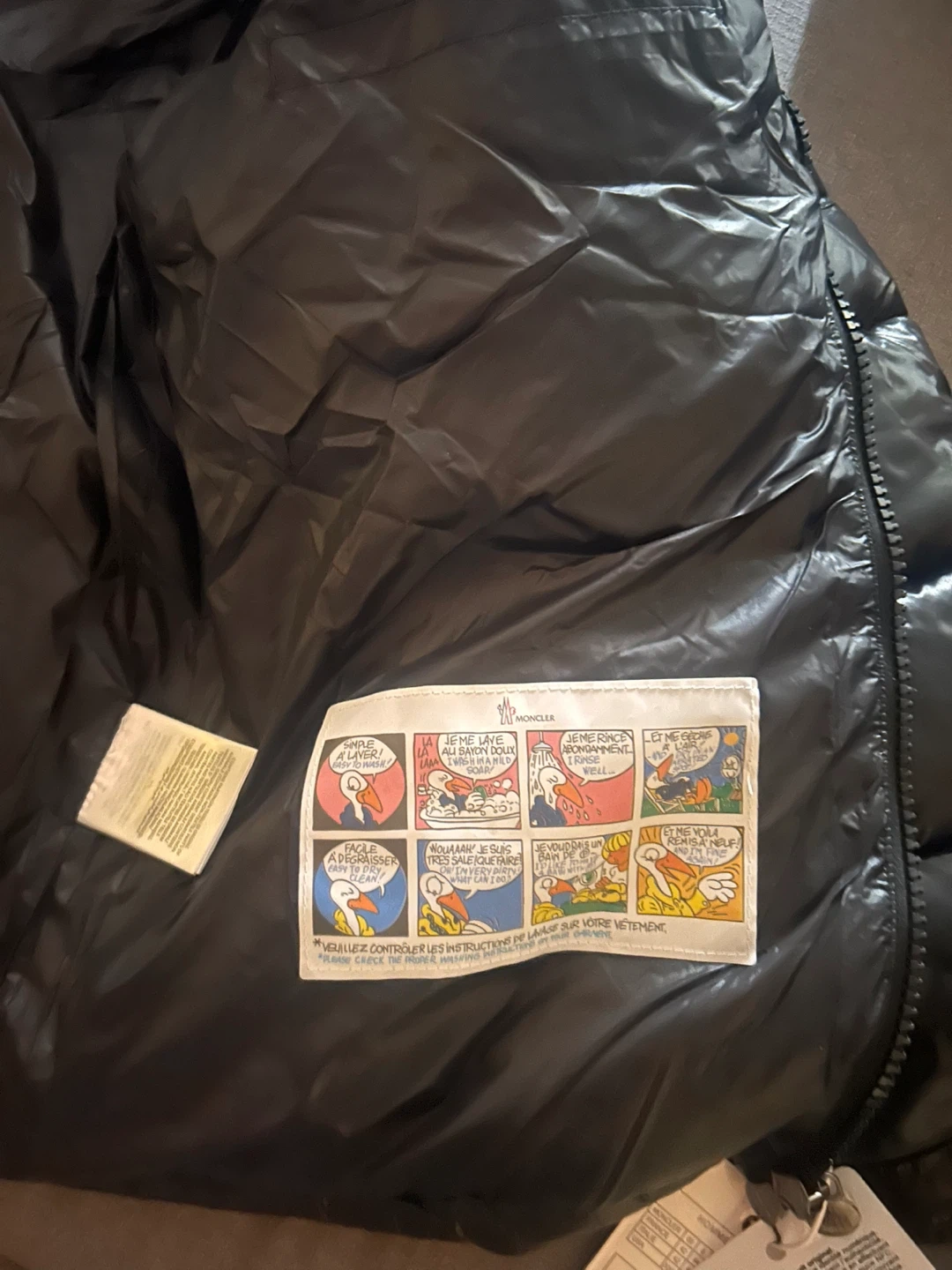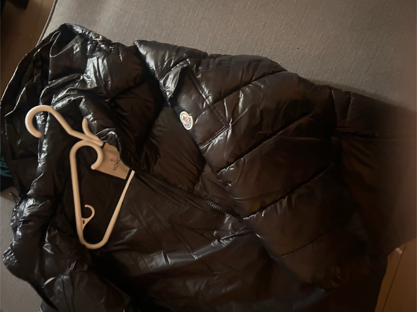 Shiny black puffer jacket from Moncler. It's a size M. Features the classic Moncler logo patch on the sleeve. Zip closure and zippered pockets.