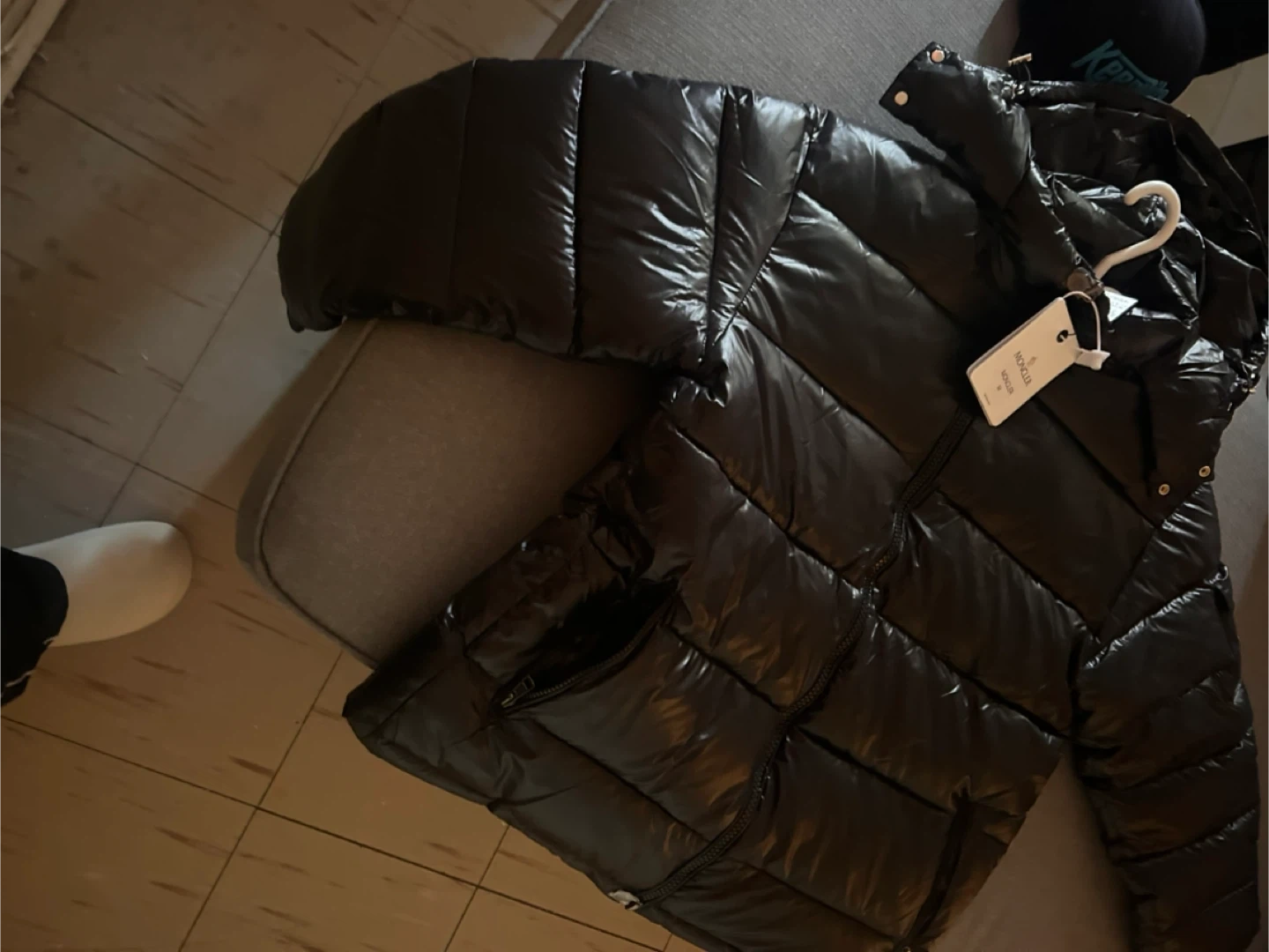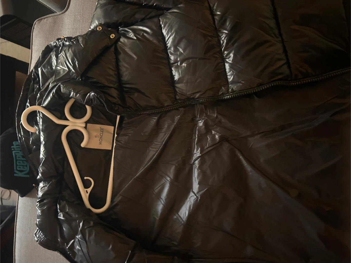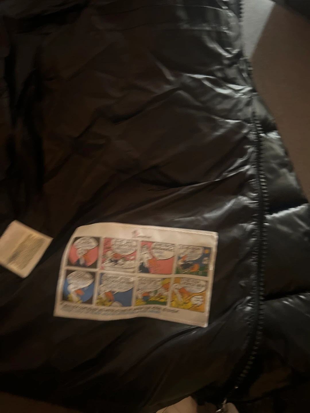 Shiny black puffer jacket from Moncler. It's a size M. Features the classic Moncler logo patch on the sleeve. Zip closure and zippered pockets.