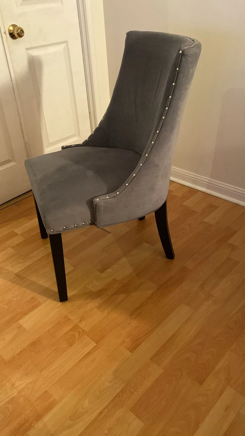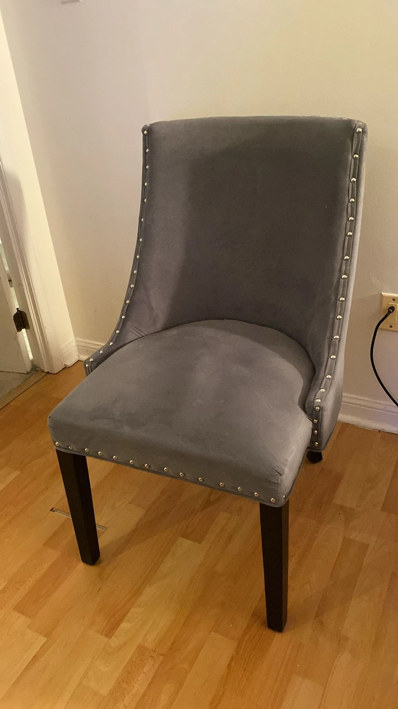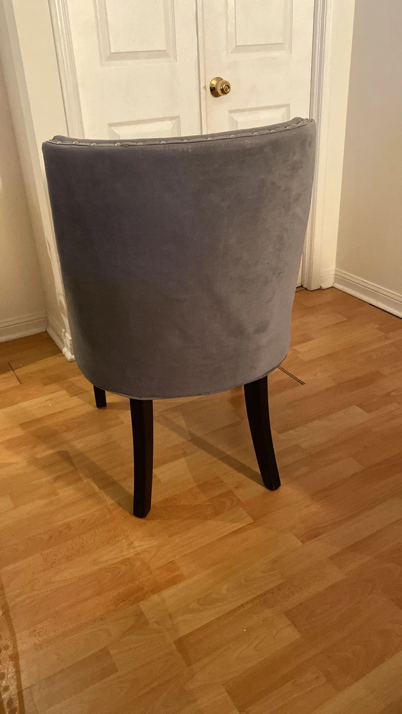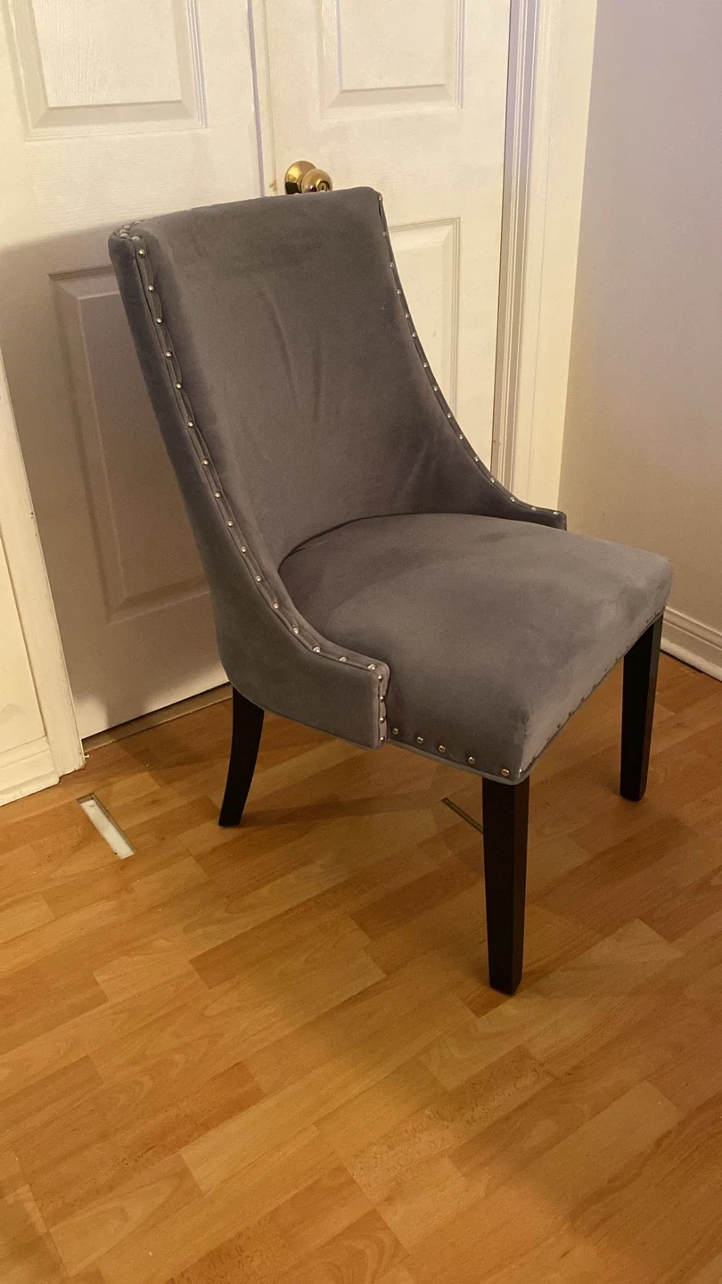 Selling a gently used dining chair. It features a grey upholstered seat and back, with dark brown legs. The chair is in great condition and would be a stylish addition to any dining room or living space