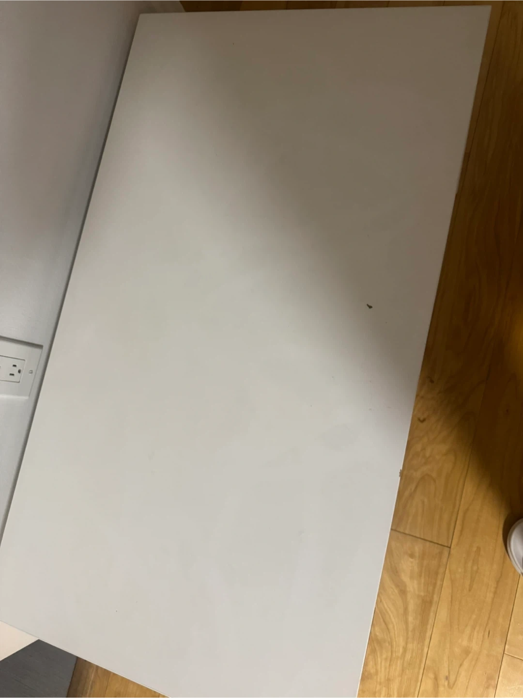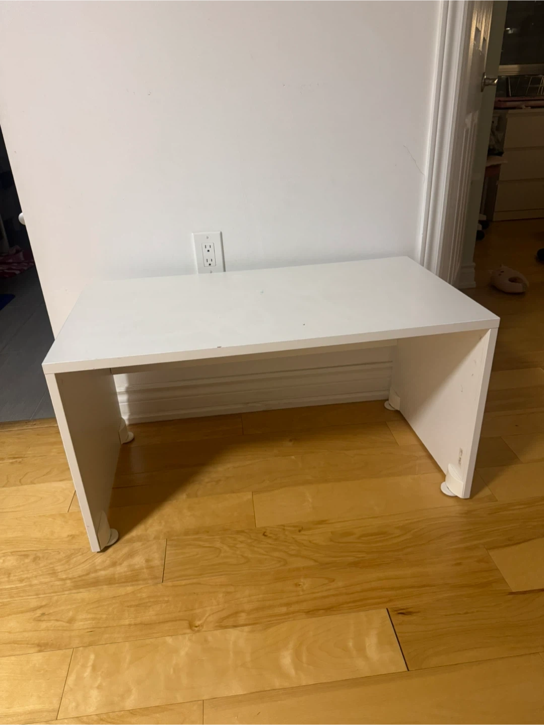A simple white console table or small desk. It's made of composite wood and has a smooth, matte finish. The unit measures 35.5 inches wide, 20 inches deep, and 19 inches high. It's a handy piece for an entryway or a small workspace!