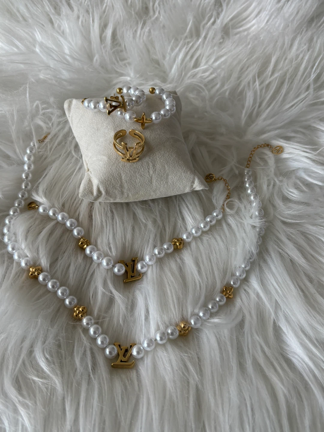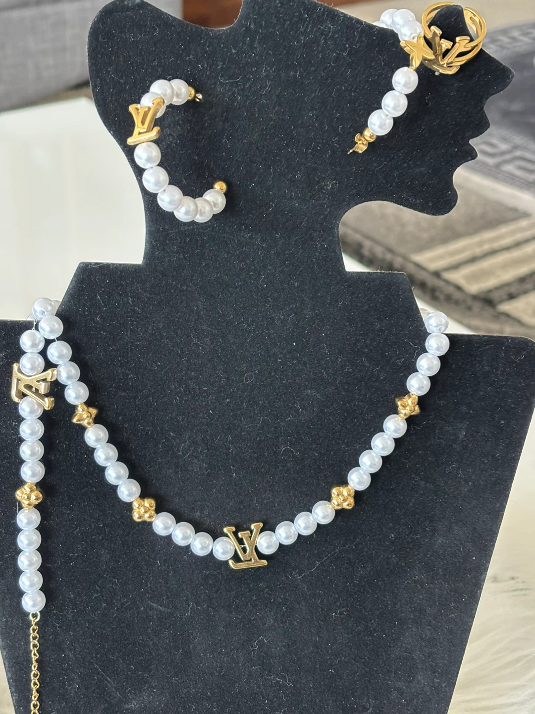 This is a 4-piece jewellery set featuring a necklace, bracelet, ring and earrings, along with a matching ring. It's made with faux pearls and gold plated -tone hardware.