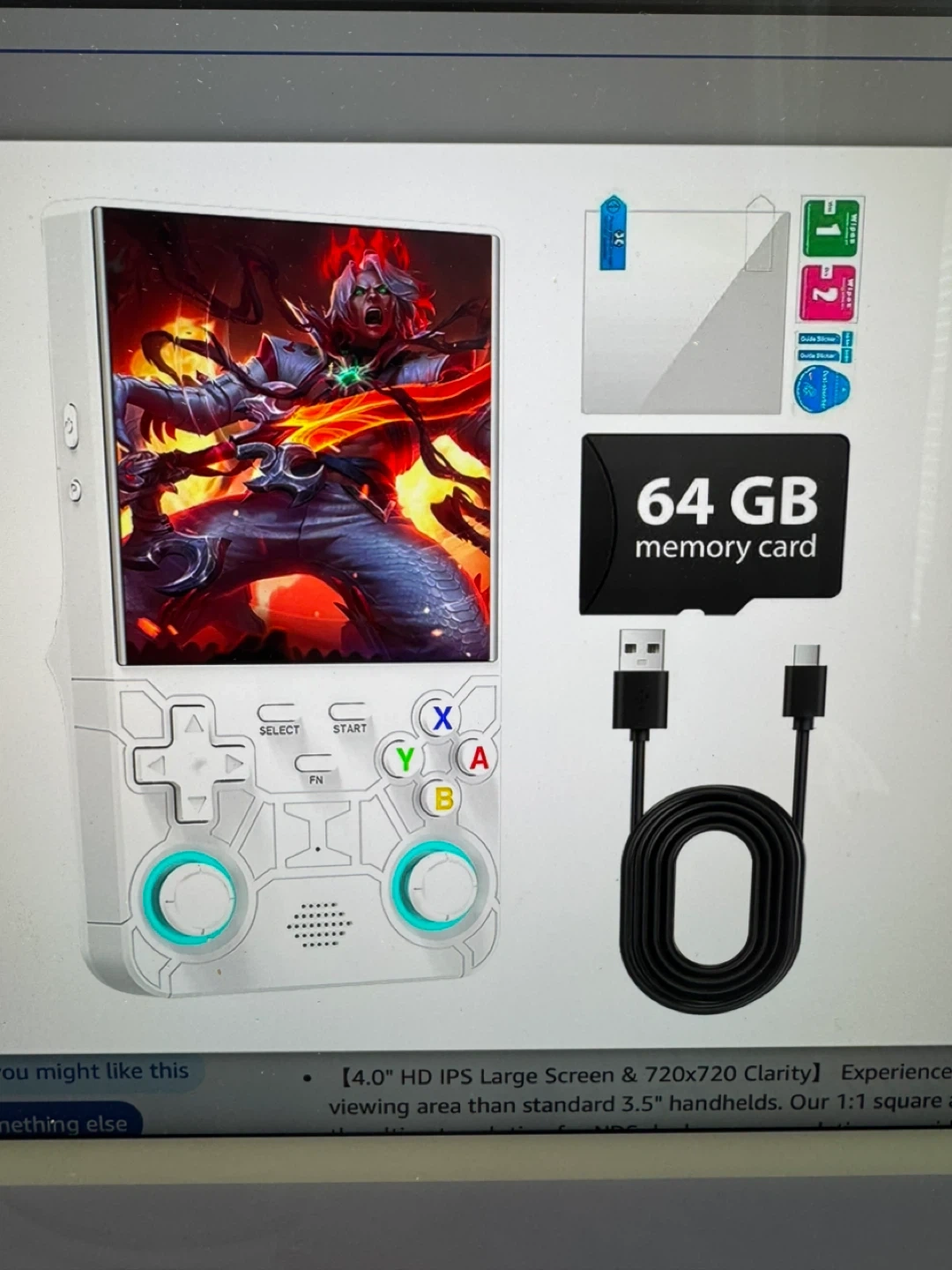 This handheld game console features a 4.0" HD IPS screen with 720x720 clarity. It includes a 64GB memory card and a charging cable. The viewing area is larger than standard 3.5" handhelds. This is great for portable gaming on the go!