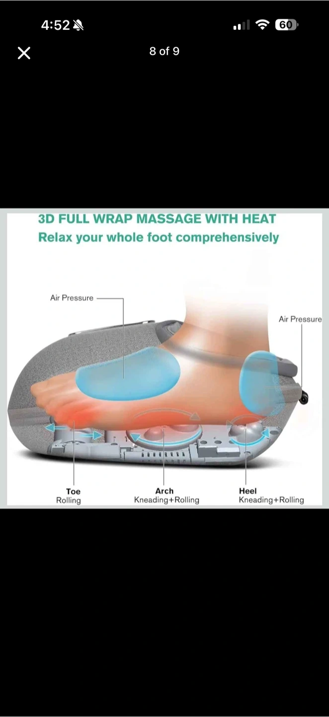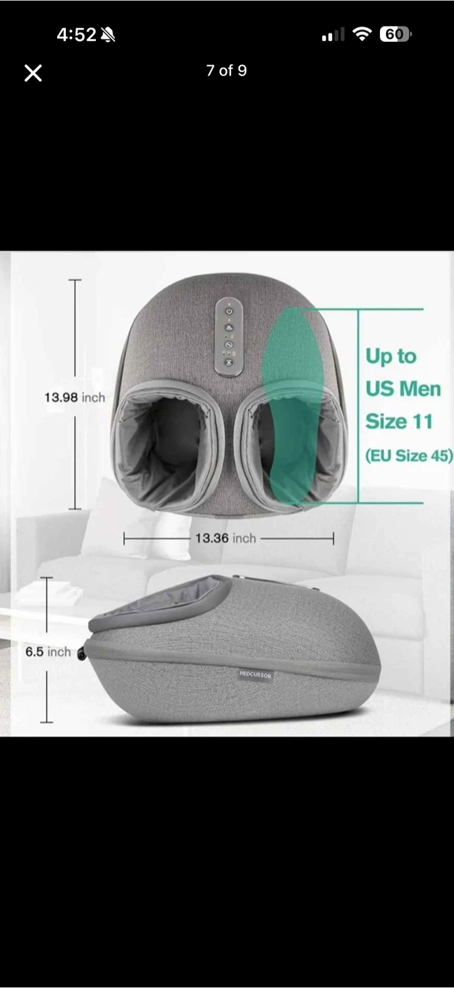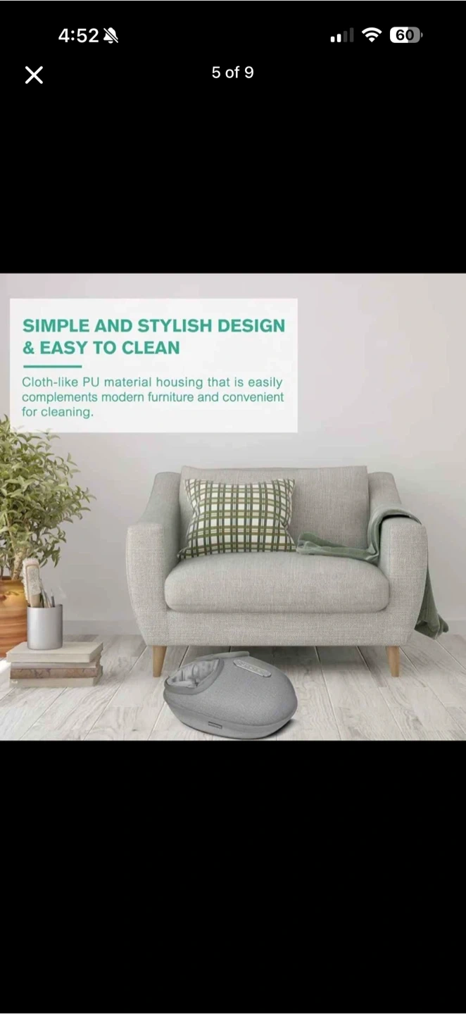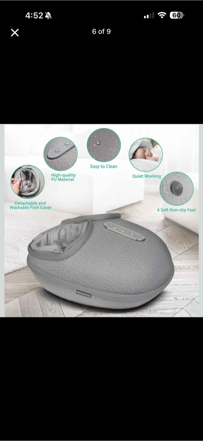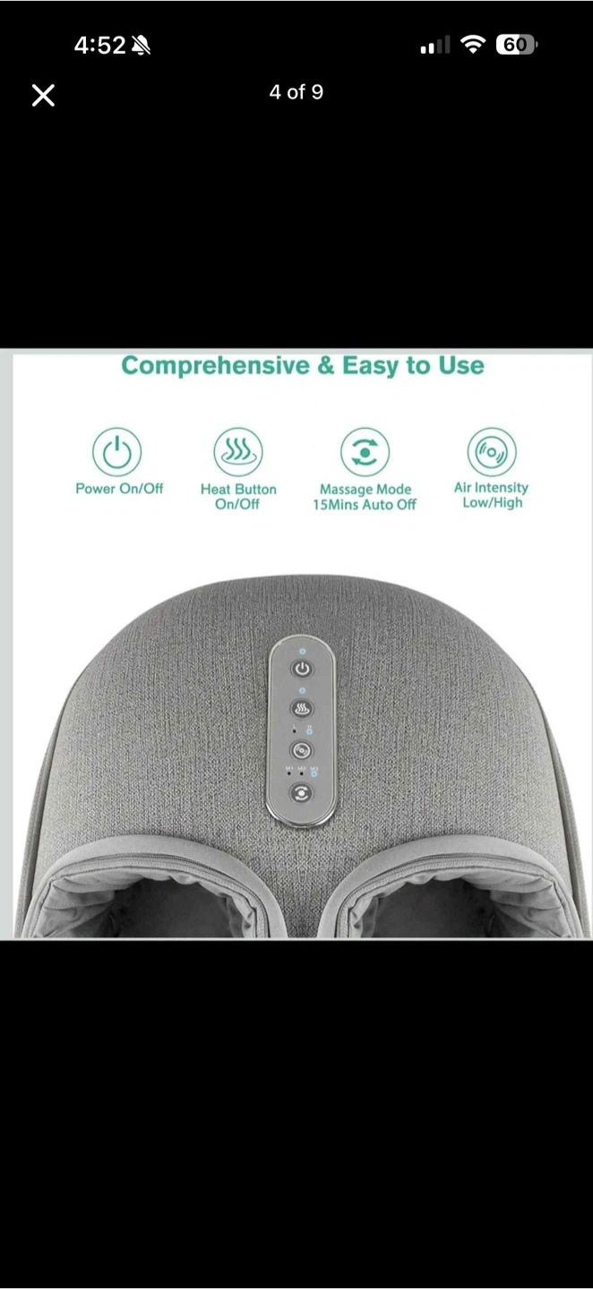 It's a grey foot massager with a cloth-like PU material housing. It features detachable and washable foot covers, 4 soft non-slip feet, and a 15-minute auto-off timer. The massager has power on/off, heat button, and adjustable air intensity.