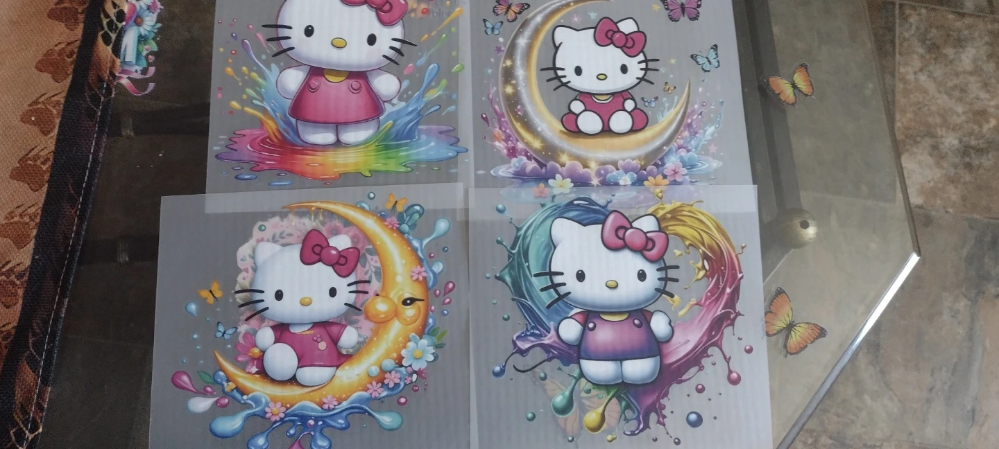 This is a set of four Hello Kitty transfer sheets. Each sheet features a unique design of Hello Kitty in colourful, playful scenes. They're perfect for adding a touch of fun to crafts or personal items! Great for the Big Hello kitty Fans. They can go on T-shirts Pillows and fabric of your choice. Selling 4/$12