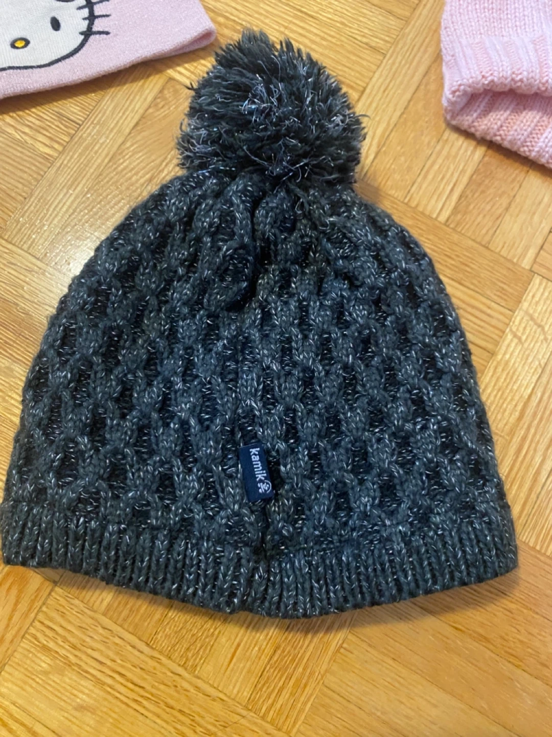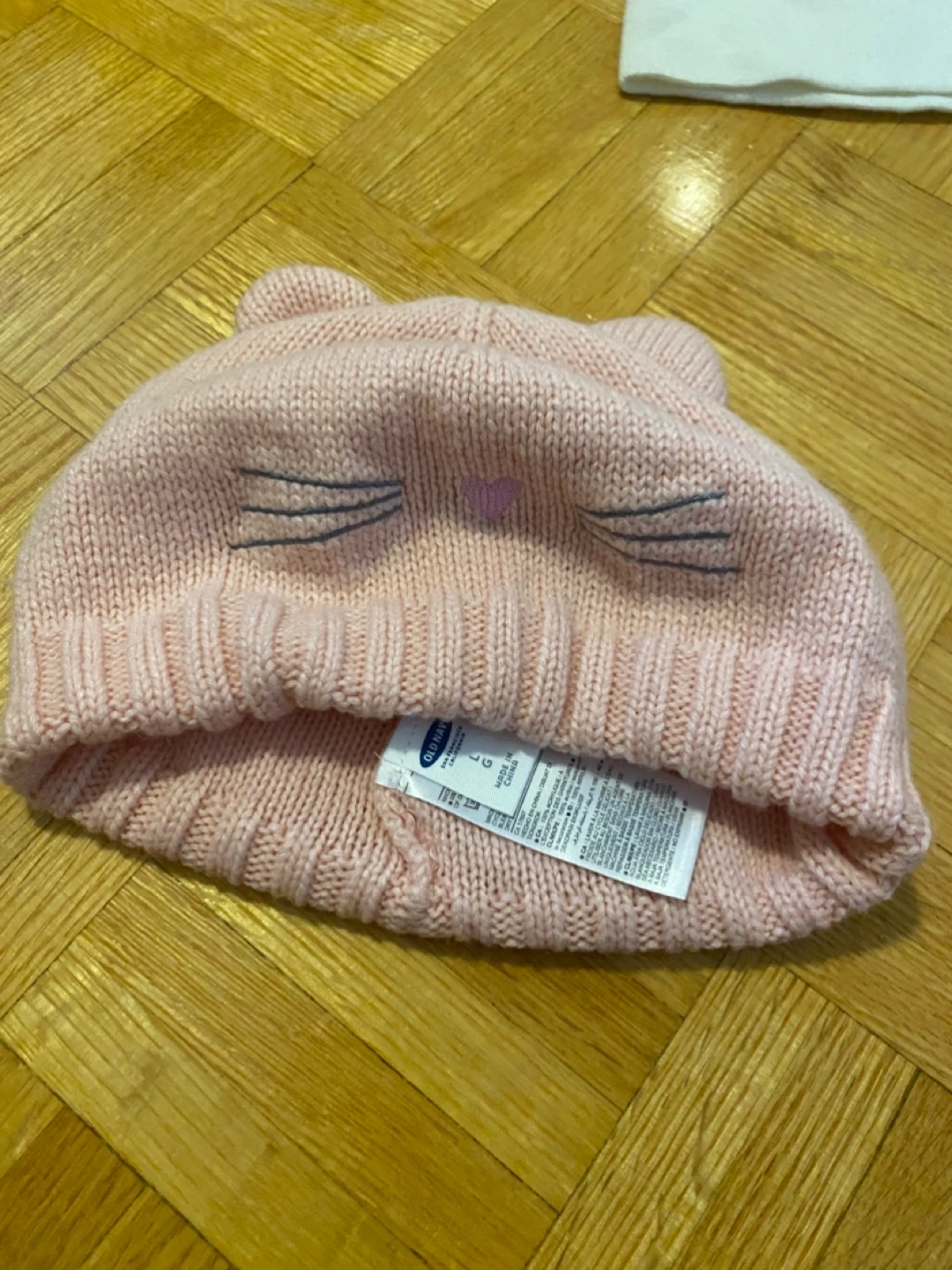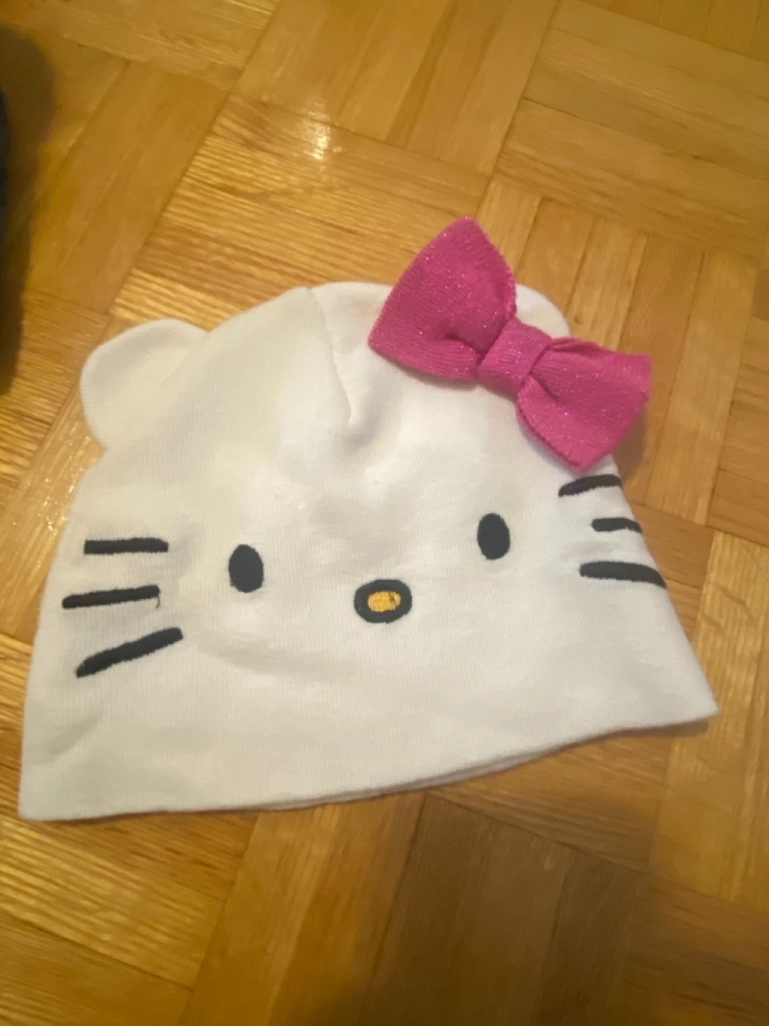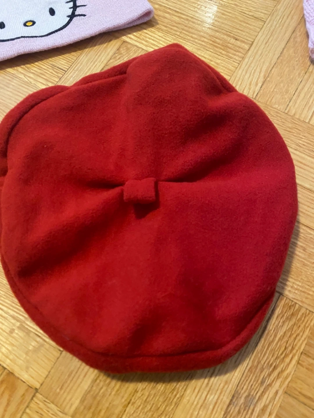This bundle includes seven assorted kids hats. There's a pink cat ear hat, a red beret, a Hello Kitty beanie, a grey pom-pom hat, and three other knitted hats in various pink shades. Great for keeping little heads warm!