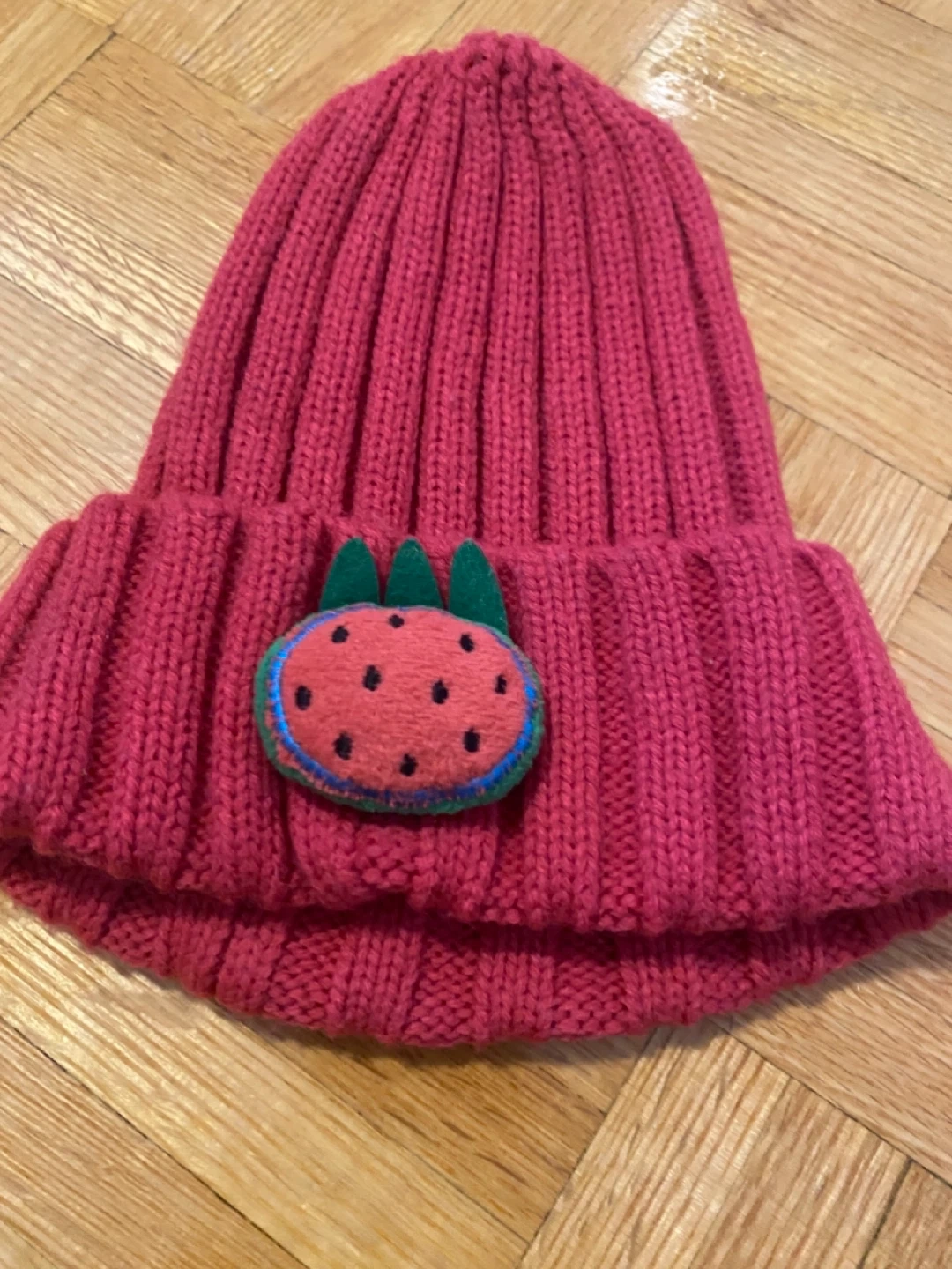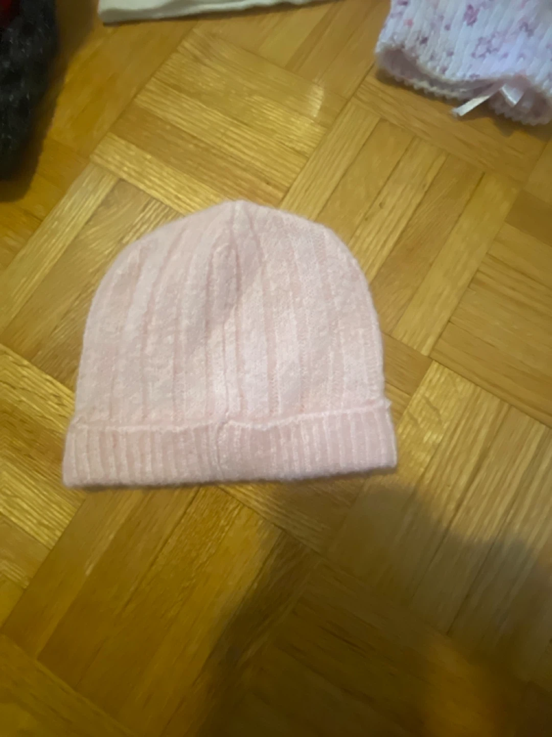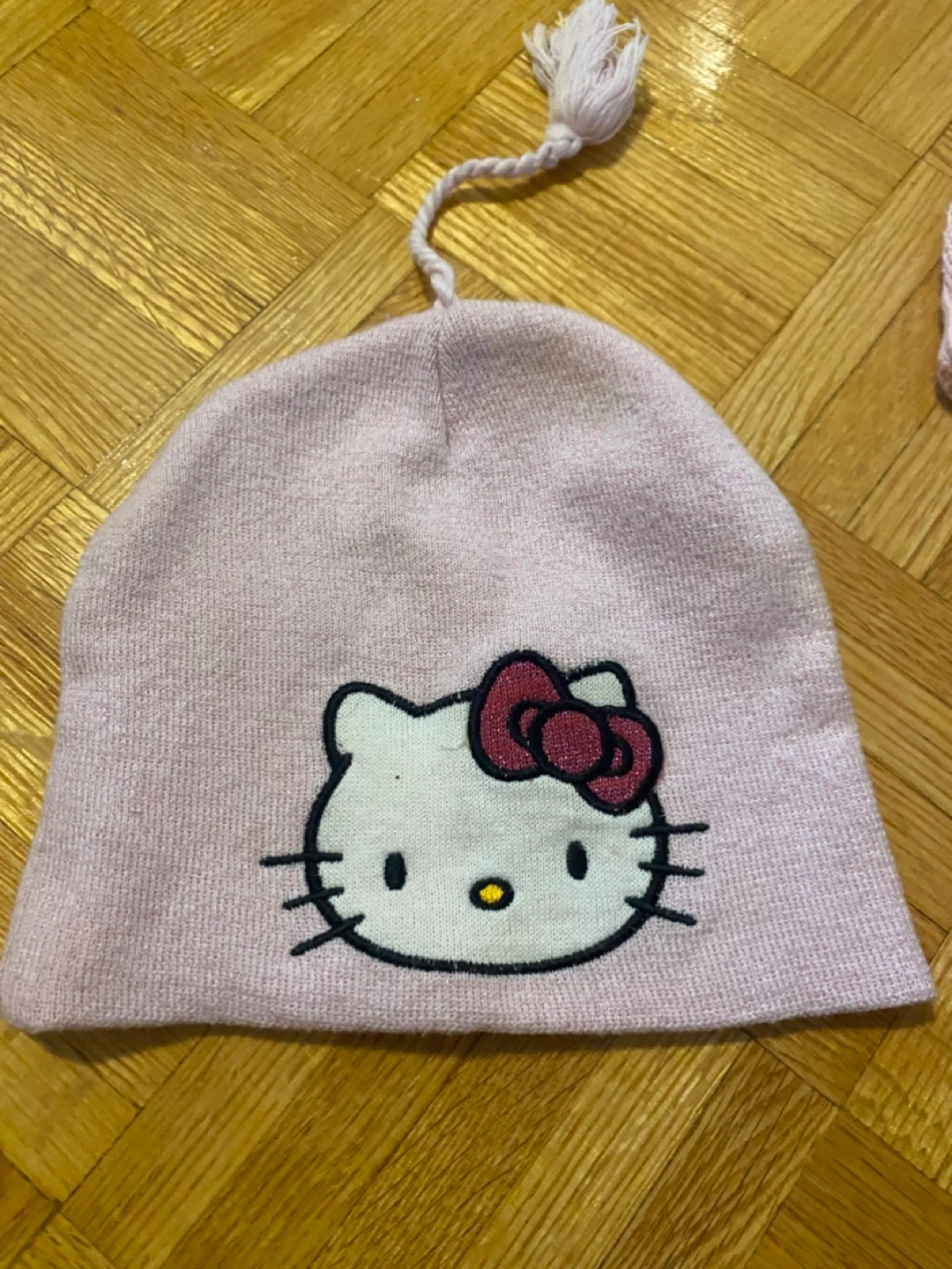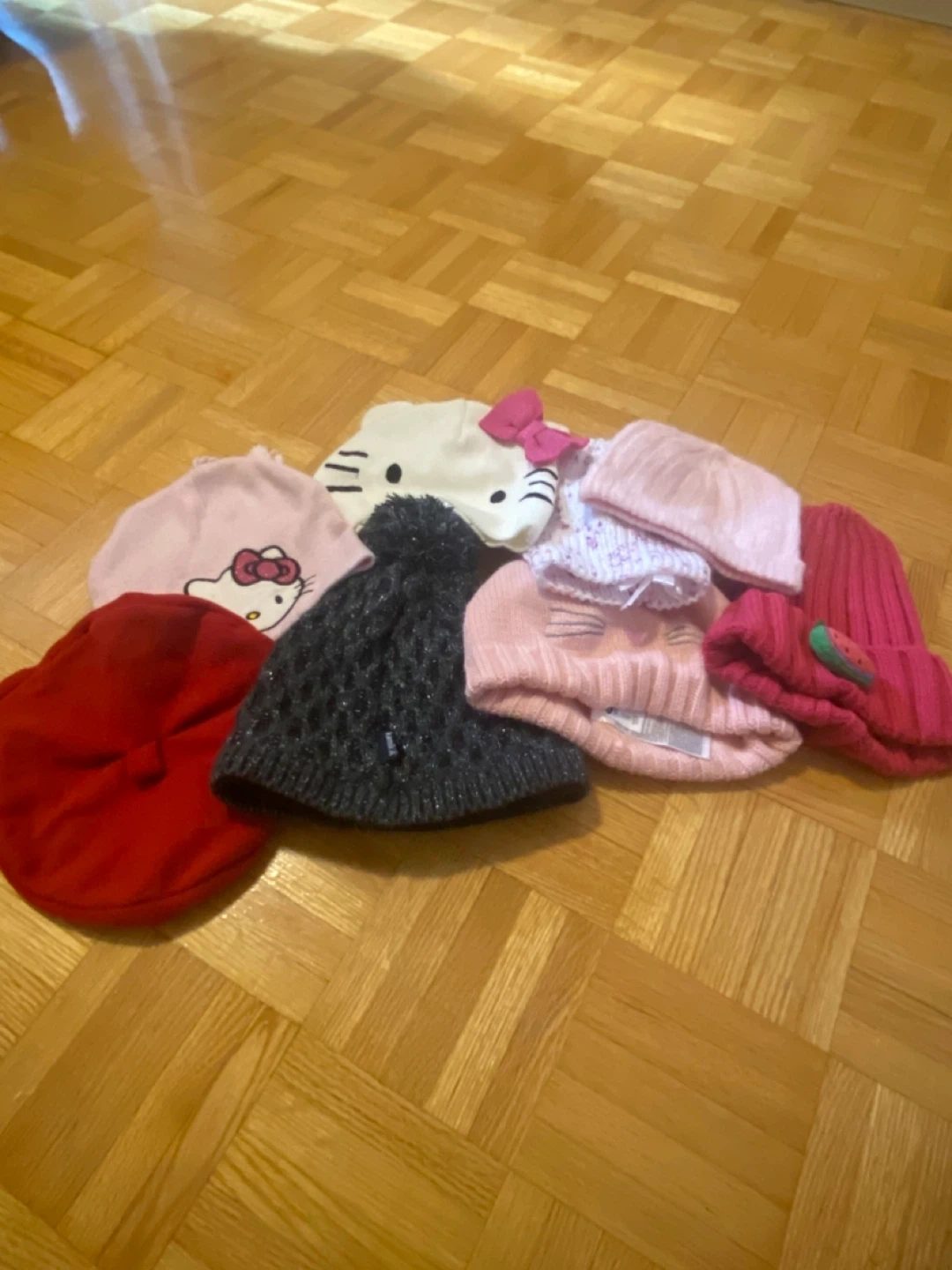 This bundle includes seven assorted kids hats. There's a pink cat ear hat, a red beret, a Hello Kitty beanie, a grey pom-pom hat, and three other knitted hats in various pink shades. Great for keeping little heads warm!