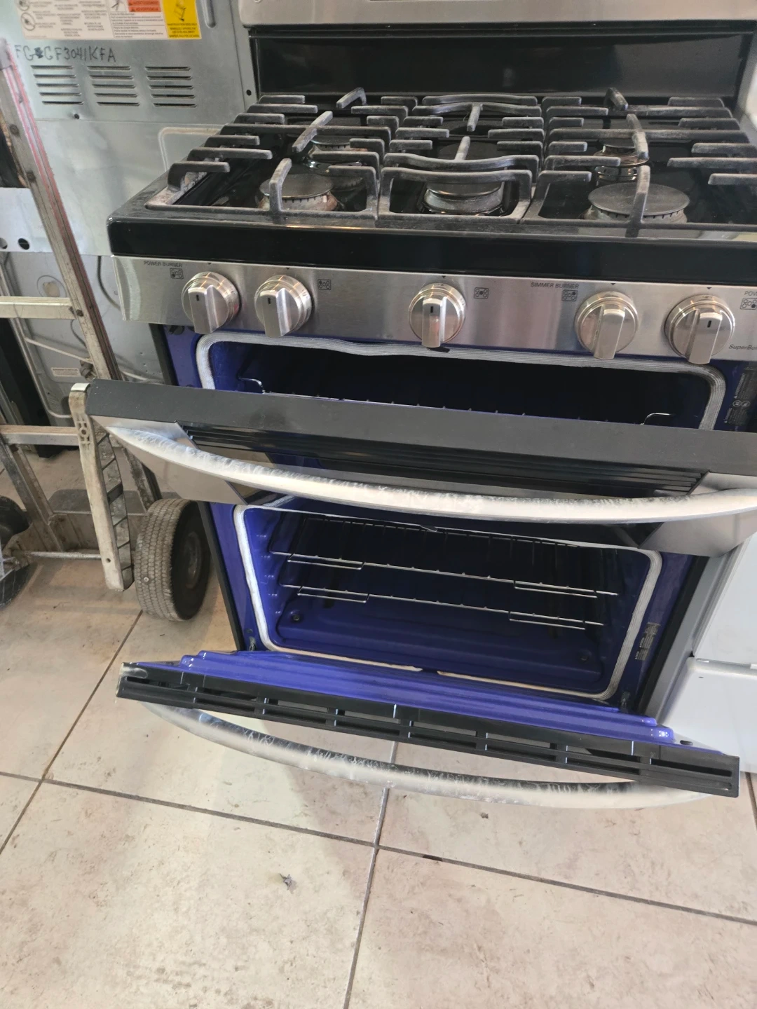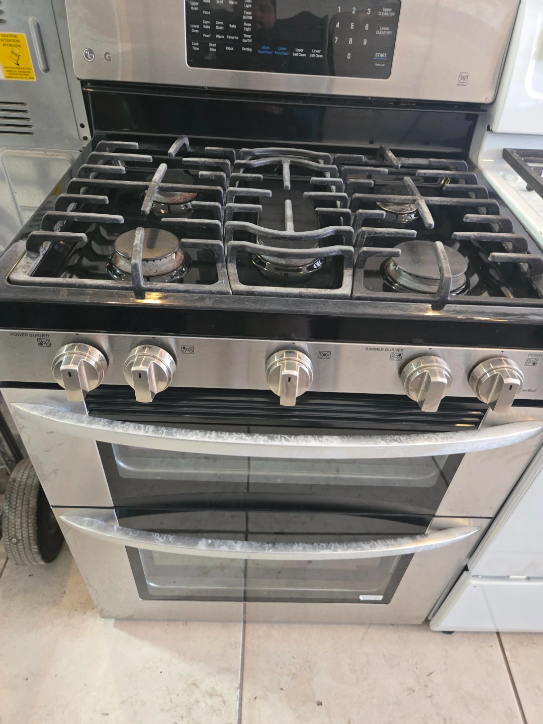 This is a stainless steel LG gas range. It features a double oven with a cooktop. It's a powerful kitchen appliance for serious cooks!