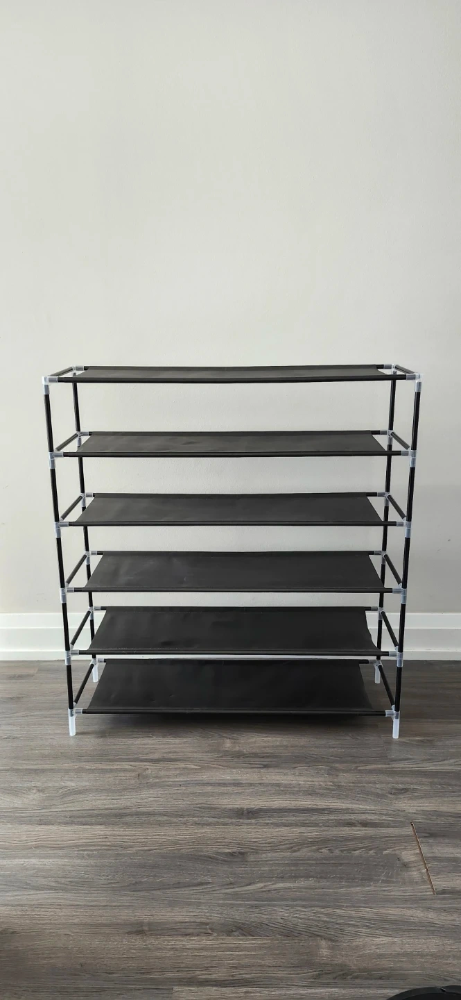 This is a 6-tier shoe rack with black fabric shelves and a metal frame. It's great for organizing footwear in your entryway or closet. The compact design makes it easy to place anywhere you need extra storage!