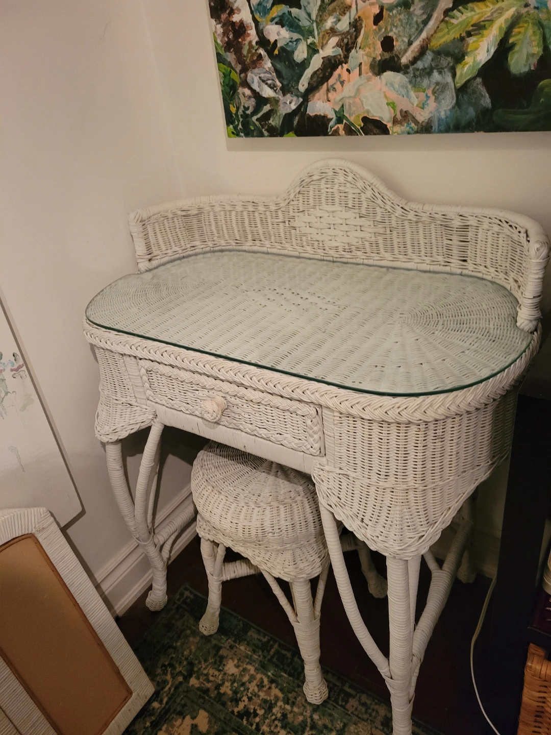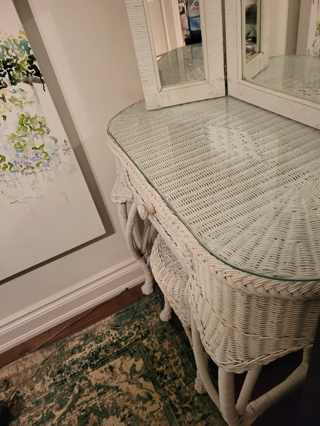 Vintage Wicker Vanity Set with Stool and Mirror. Makeup Table