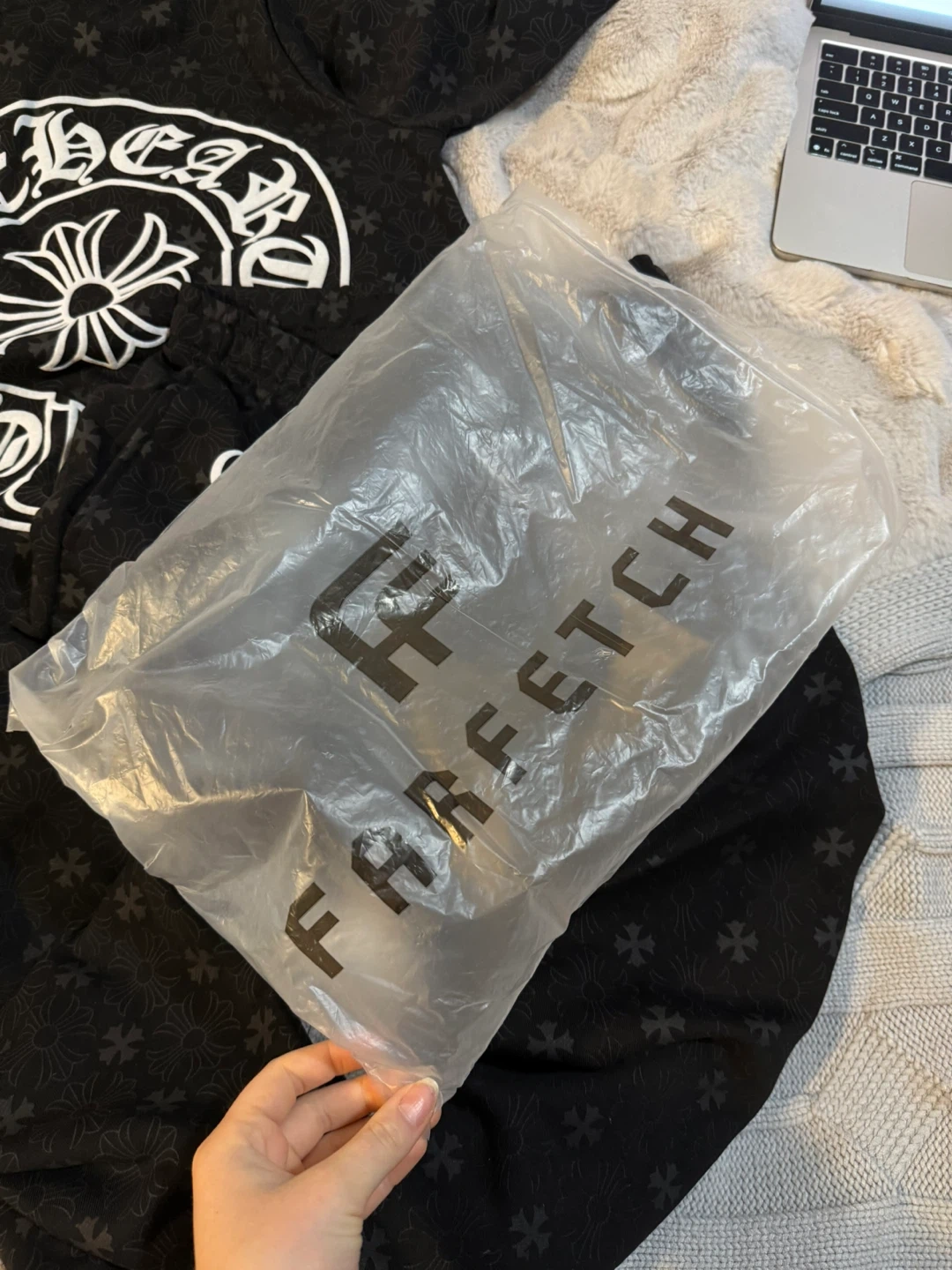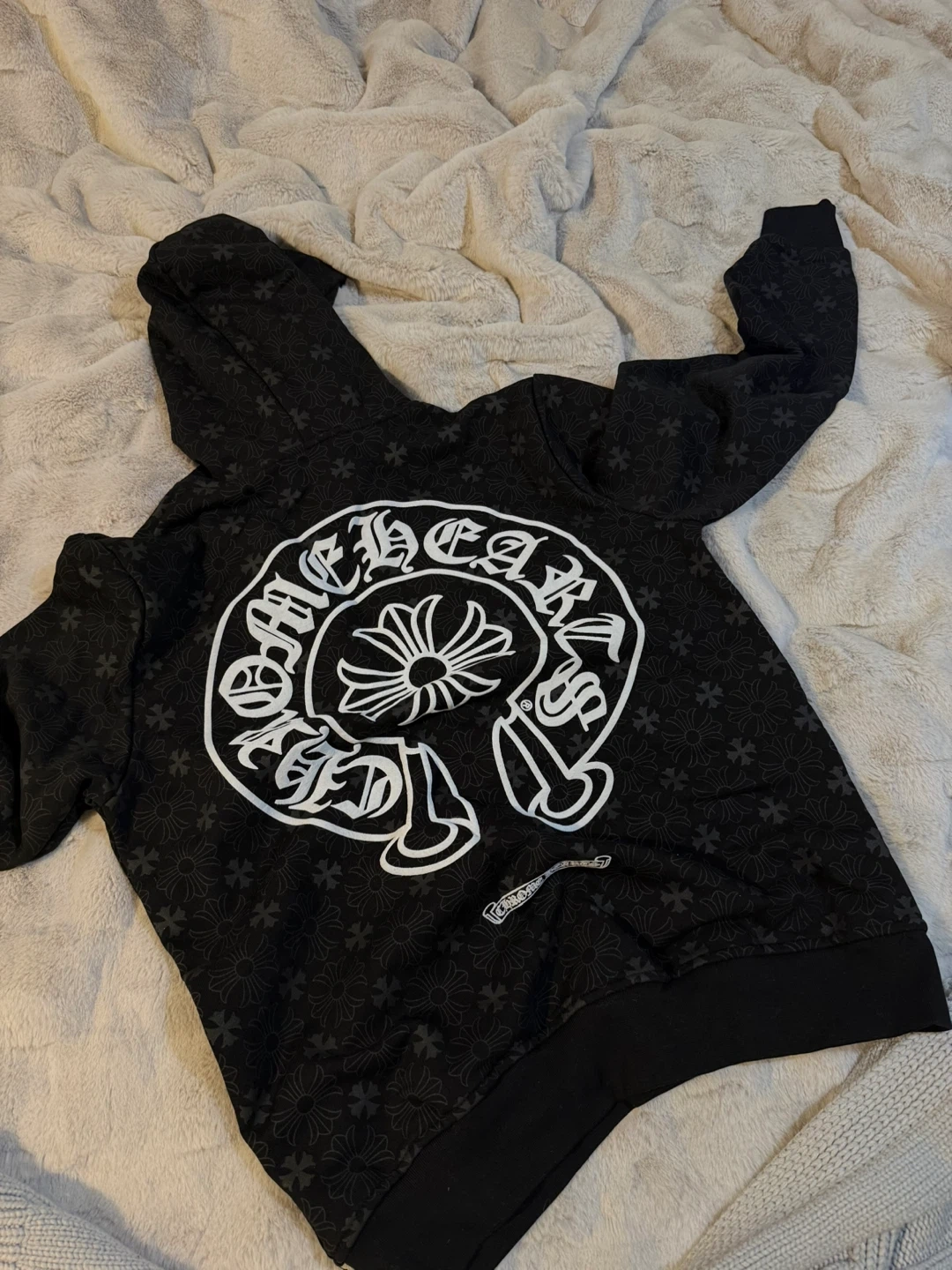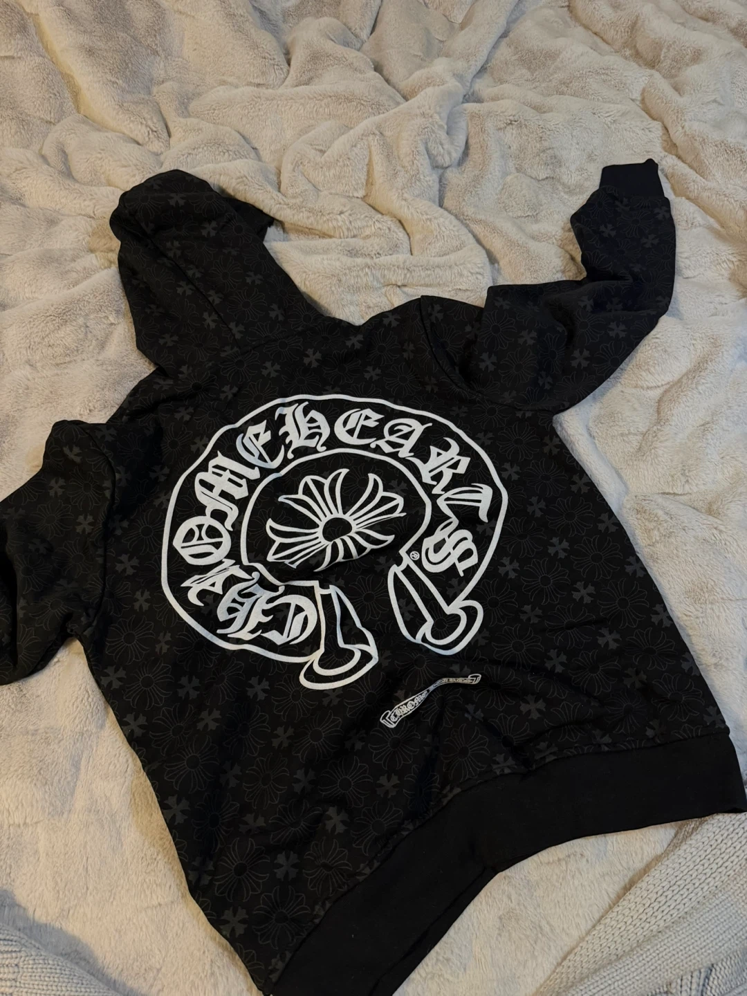 This is a Chrome Hearts black hoodie and joggers set with a repeating floral cross print. The hoodie is size small and has the signature Chrome Hearts logo on the back. The joggers also feature the all-over print and a drawstring waist. Includes Farfetch packaging.