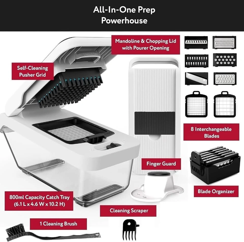 Includes 8 precision blades for versatile prep: 2 dicing blades (fine & large), julienne, slicer, zester, coarse grater, fine grater, and mandoline. Perfect for slicing, dicing, grating, and garnishing.