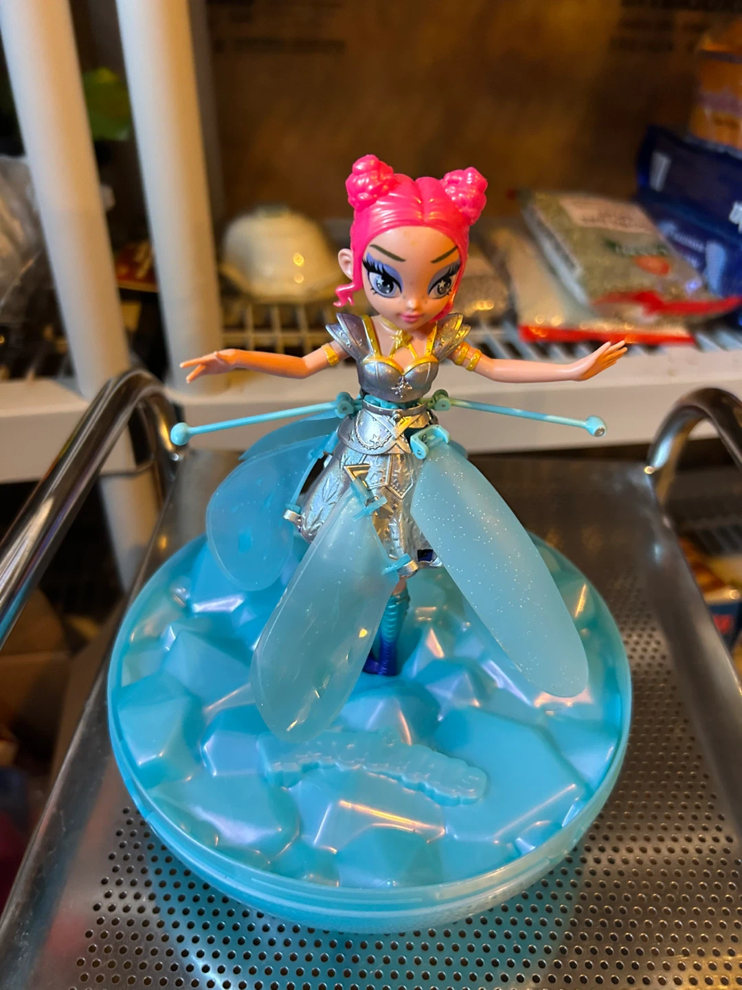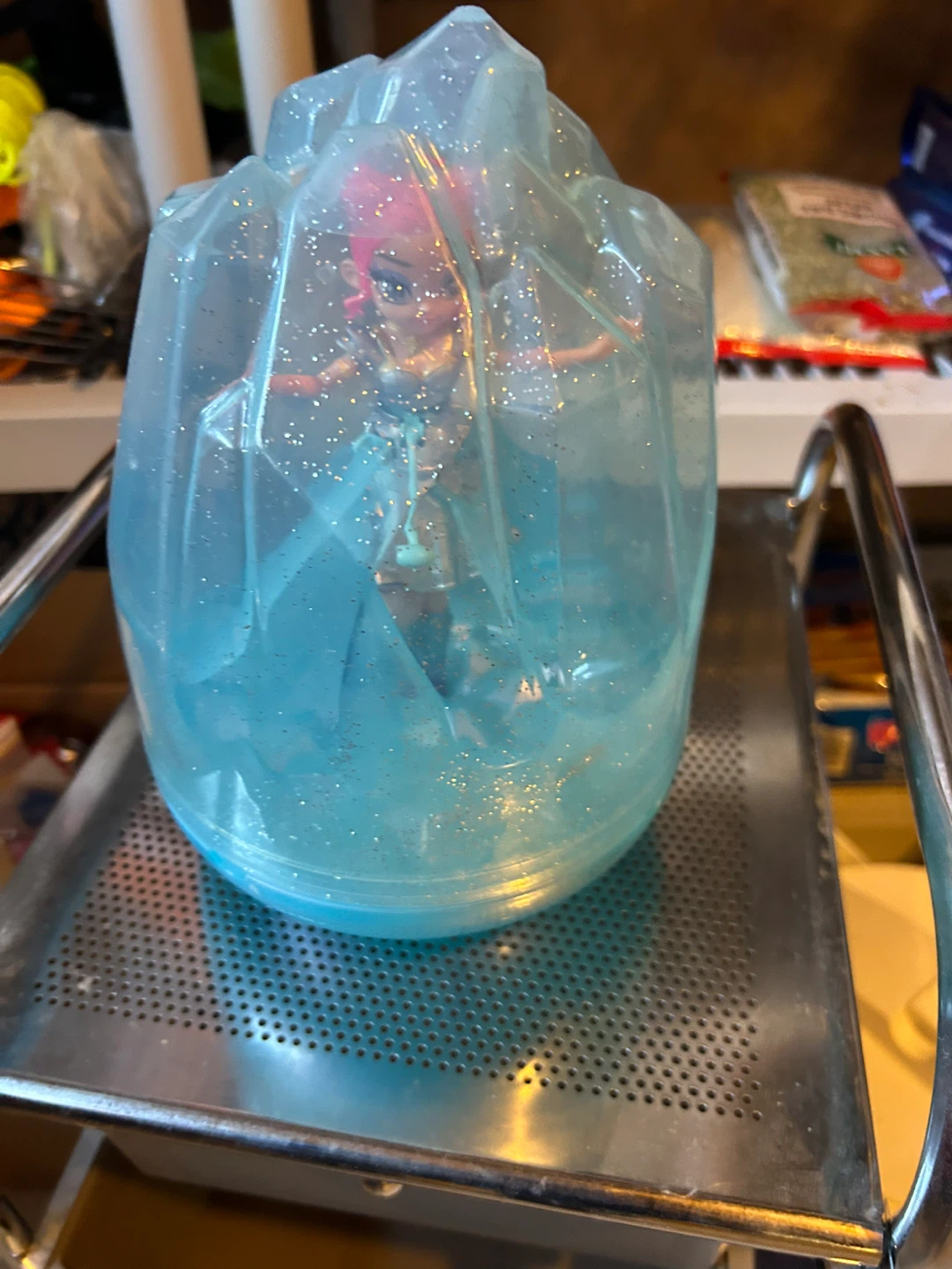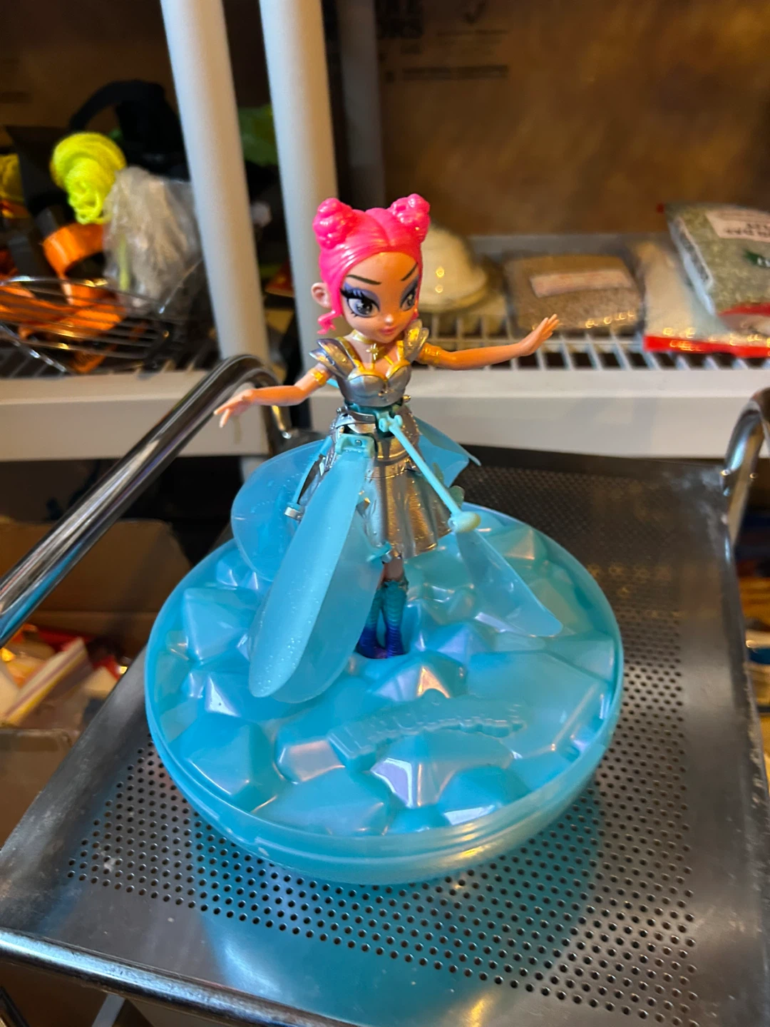 This is a Novi Stars doll. It's a collectible toy with bright pink hair and a sparkly blue outfit. The doll comes with its own display stand. It's a fun toy for imaginative play!