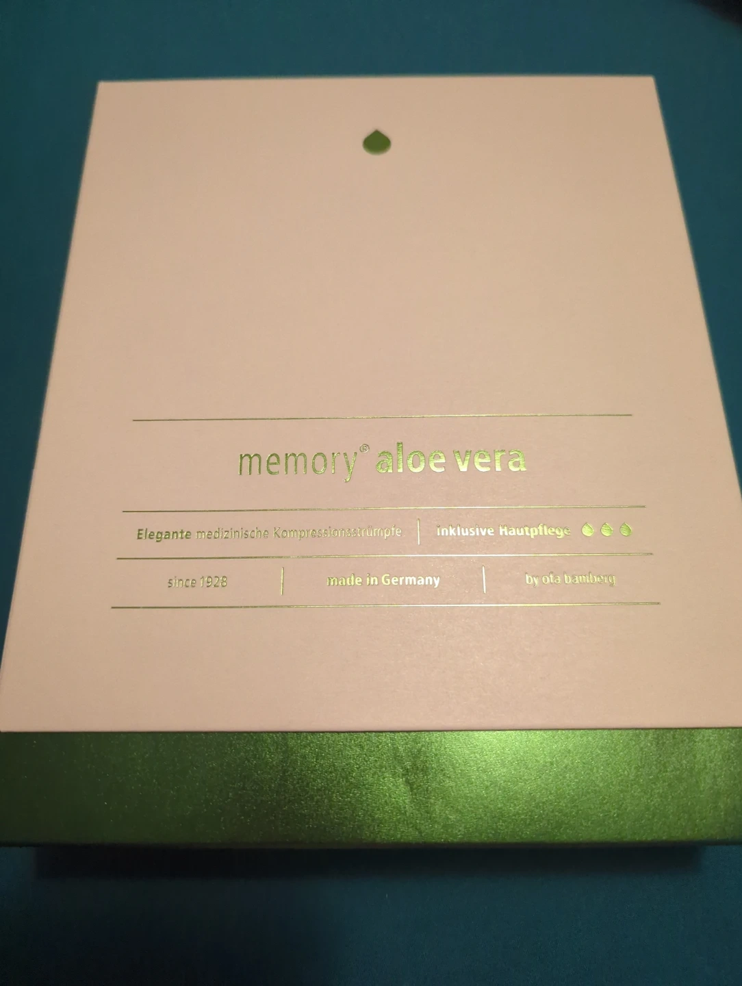 These are Memory Aloe Vera compression stockings. Made in Germany since 1928. Includes skincare.