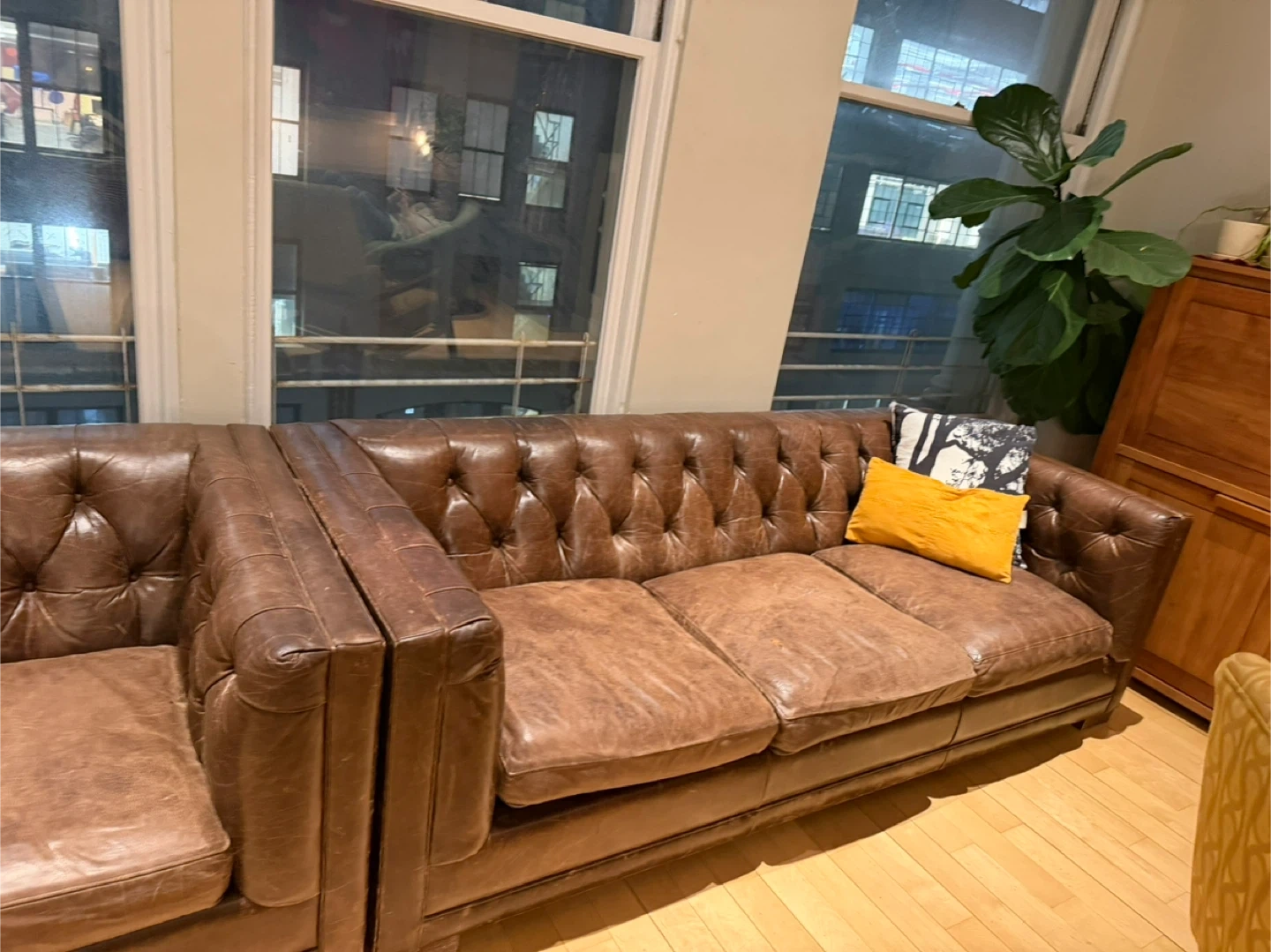 This is a classic Chesterfield sofa upholstered in distressed brown leather. It features deep button tufting on the back and arms, with plush seat cushions. It's a substantial piece of furniture that adds a touch of vintage style to any living space.