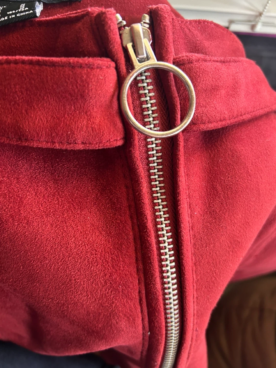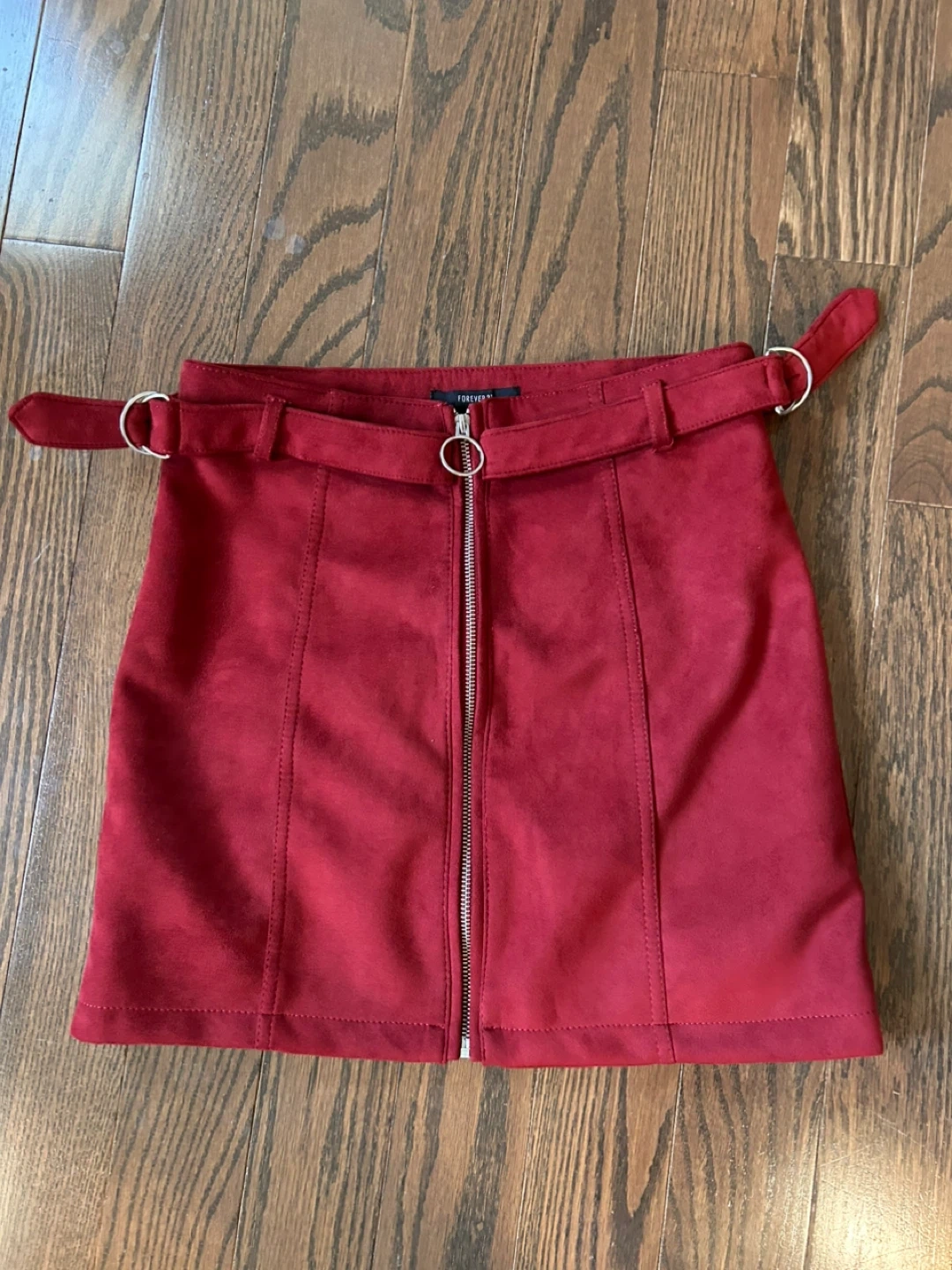A chic red mini skirt from Forever 21. It features a front zipper closure with a ring pull and belt loops with D-ring accents. The material feels like soft suede. This skirt is great for a night out or a stylish casual look!