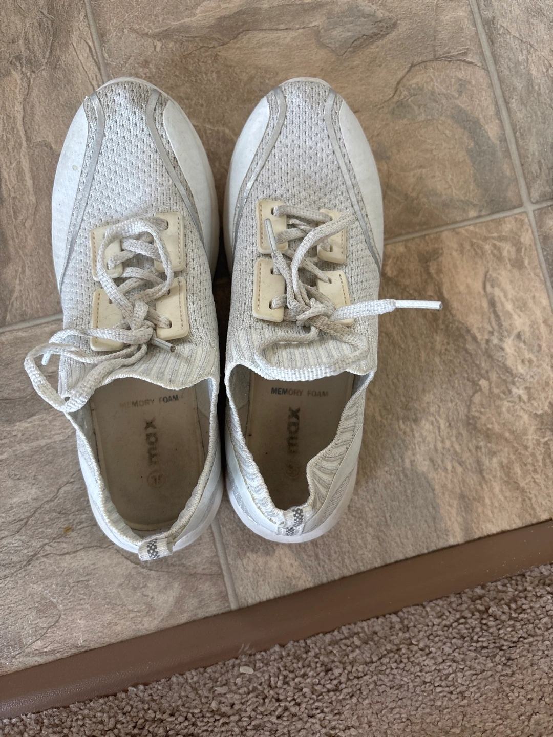 Selling a pair of Memory Foam MAX sneakers in white. They show some signs of wear but still have lots of life left! These are super comfy for everyday wear.