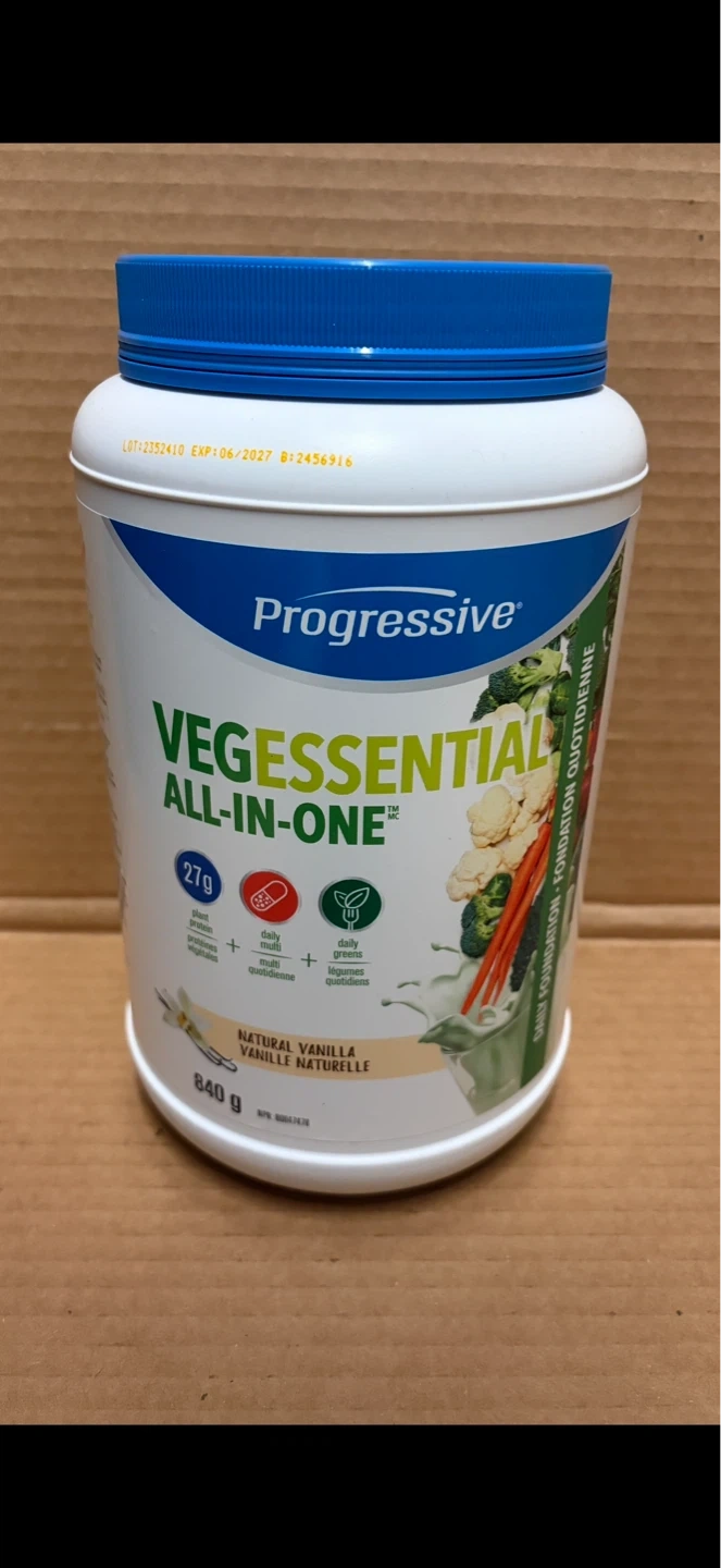 Progressive Vegessential All-In-One protein powder in Natural Vanilla flavour. It contains 27g of protein per serving.