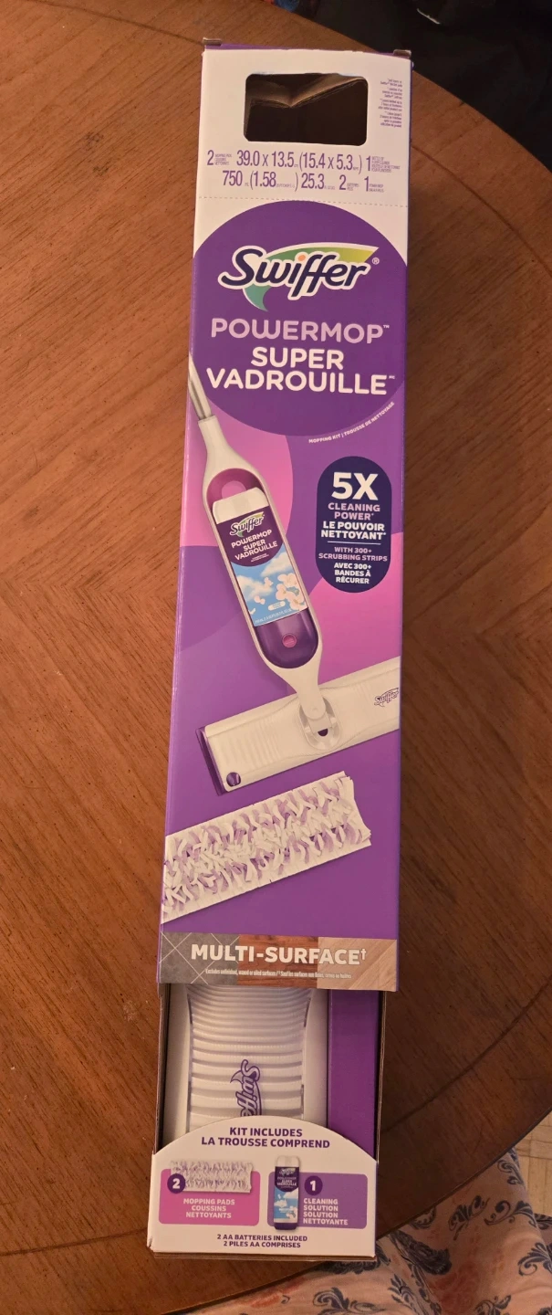 This Swiffer PowerMop kit includes the mop, 2 mopping pads, a bottle of cleaning solution, and 2 AA batteries. It's designed for multi-surface cleaning. The mop offers 5X cleaning power with scrubbed strips.