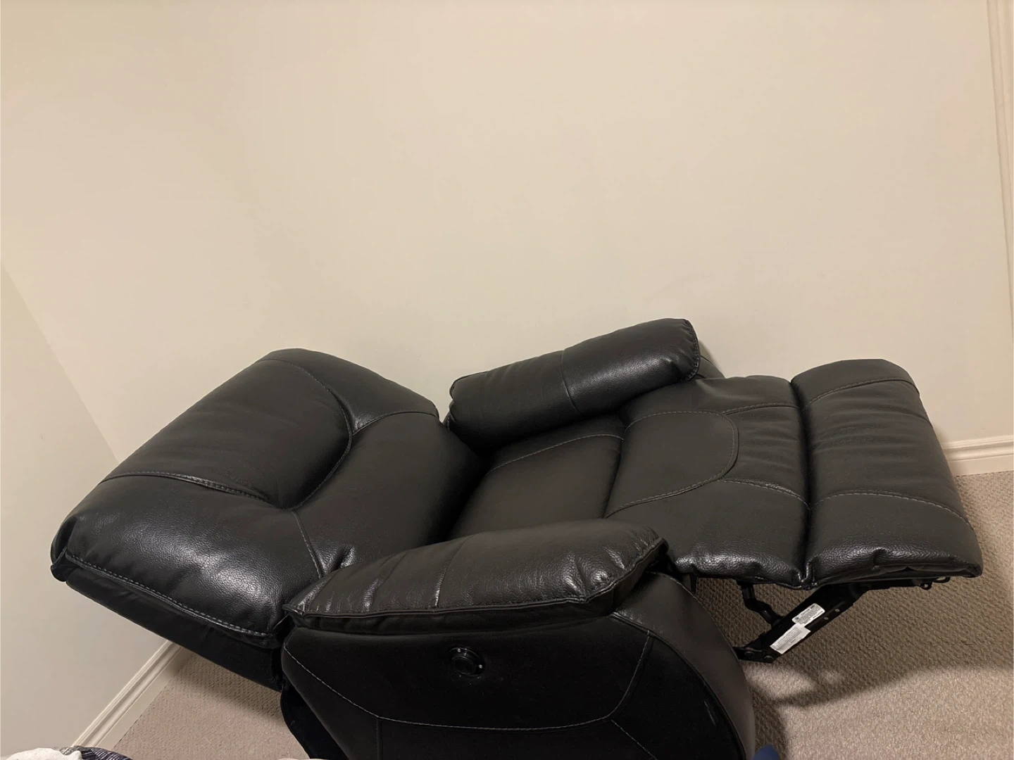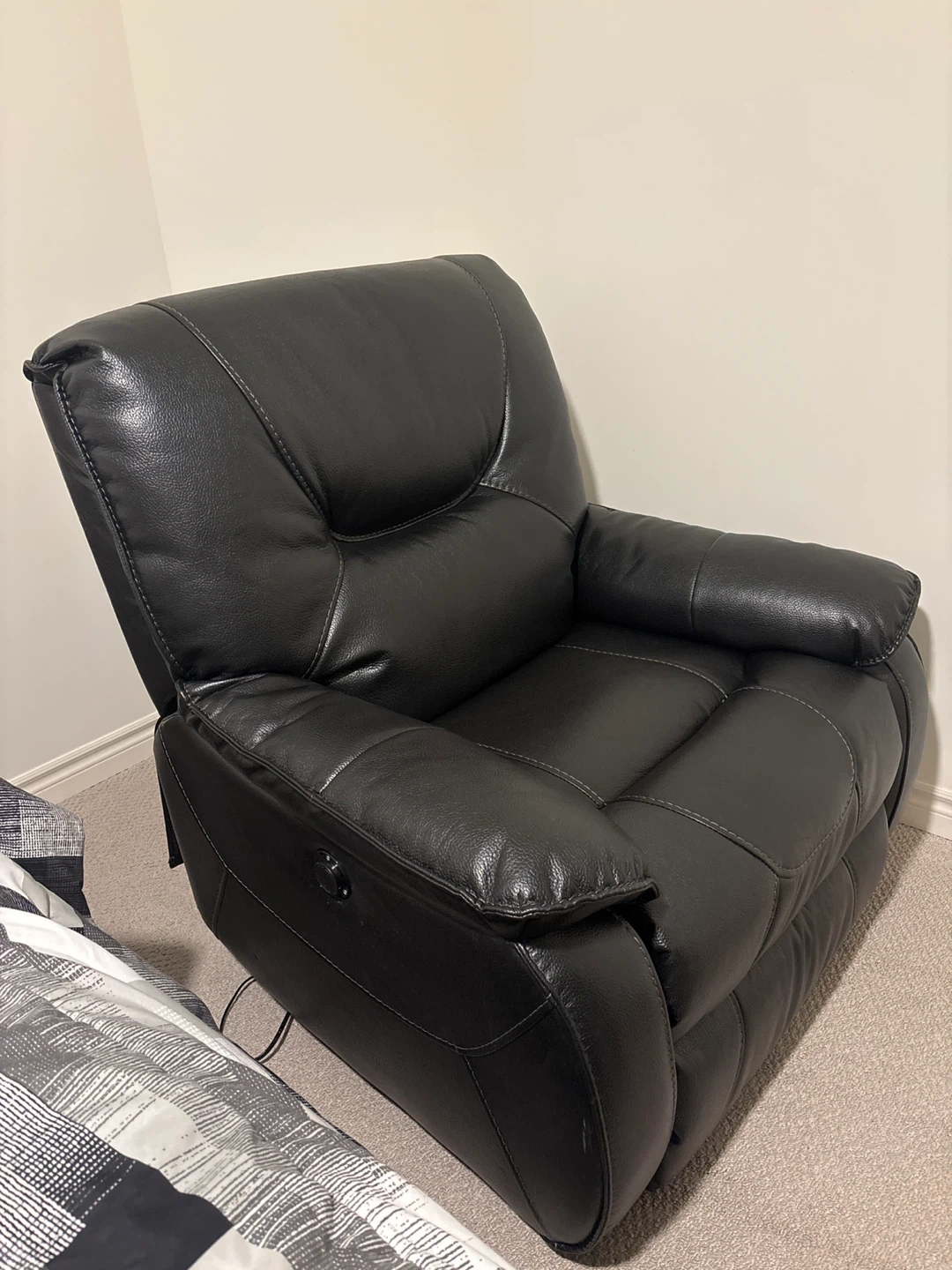 Selling a comfy black leather recliner chair! It's in good condition and perfect for relaxing after a long day. It has a smooth reclining function and is super comfortable. Great for any living room or entertainment space!