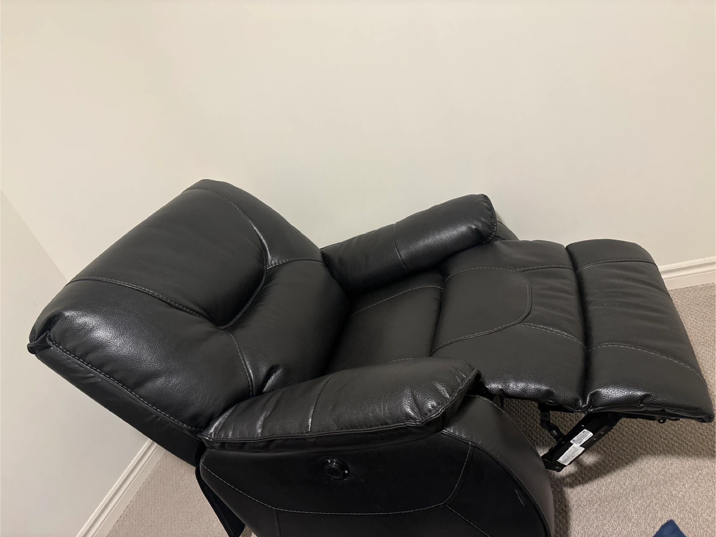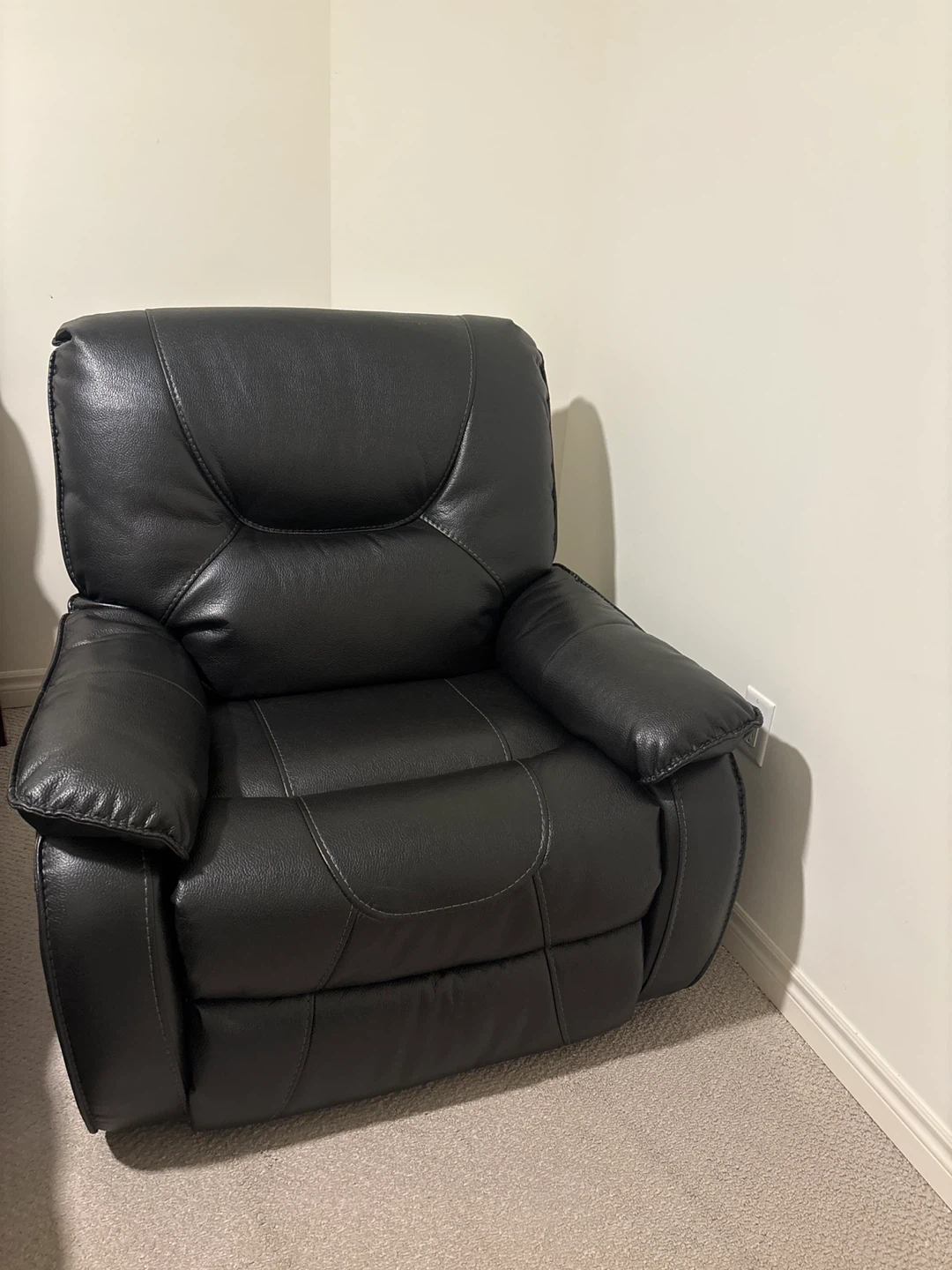 Selling a comfy black leather recliner chair! It's in good condition and perfect for relaxing after a long day. It has a smooth reclining function and is super comfortable. Great for any living room or entertainment space!