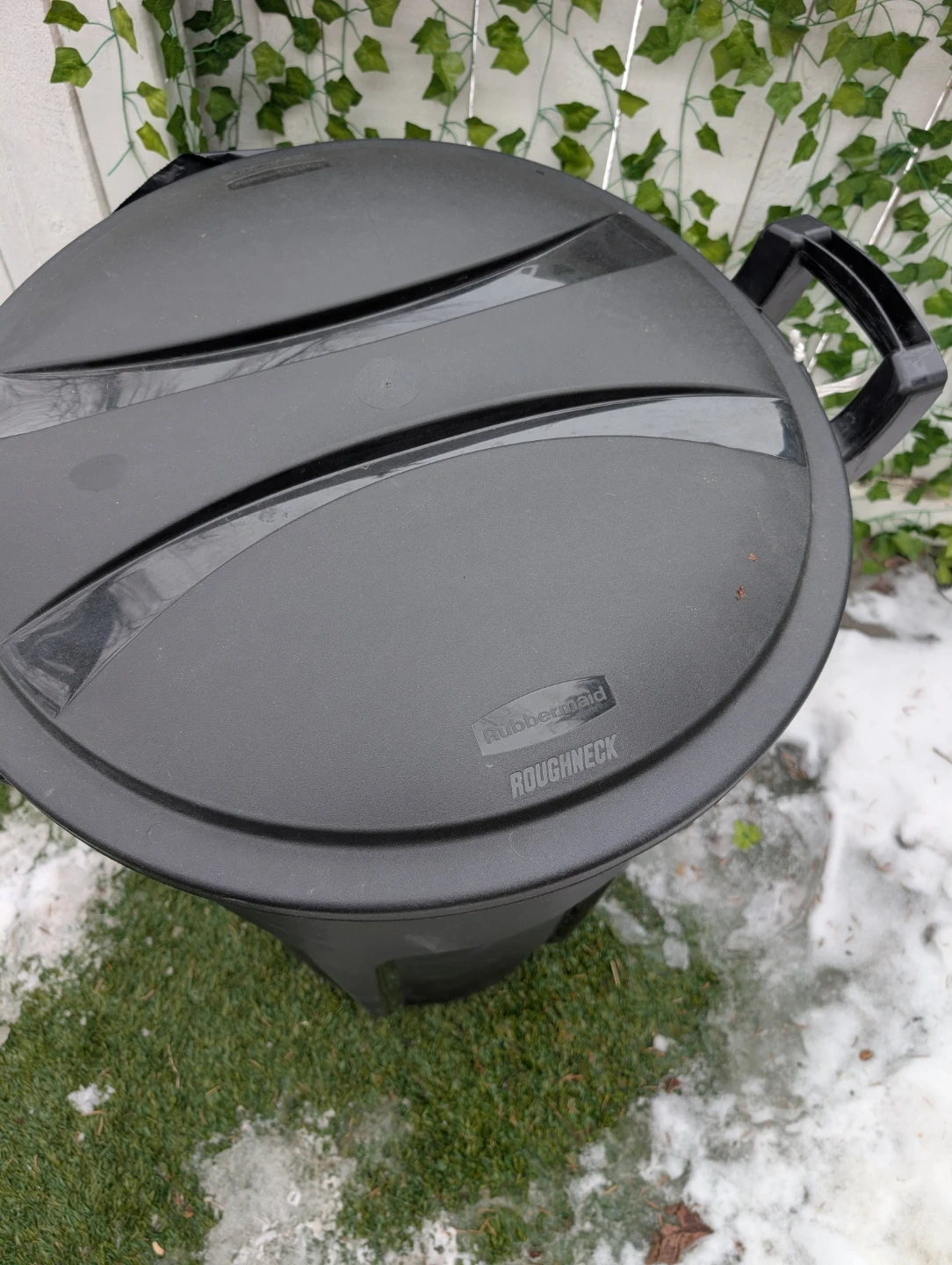 This is a Rubbermaid 121 L (32 Gallon) Roughneck outdoor trash can. It features animal resistance and wheels for easy mobility. Great for keeping your outdoor space tidy!