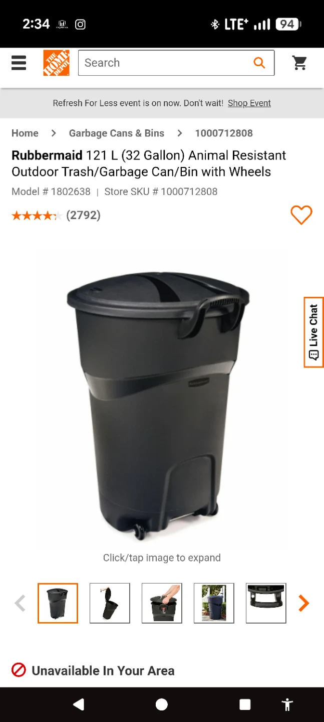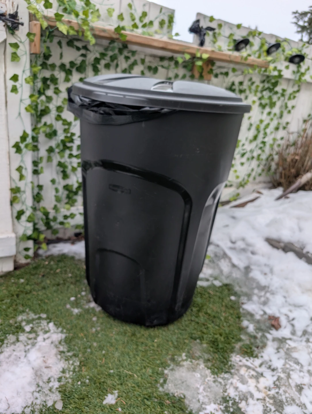 This is a Rubbermaid 121 L (32 Gallon) Roughneck outdoor trash can. It features animal resistance and wheels for easy mobility. Great for keeping your outdoor space tidy!