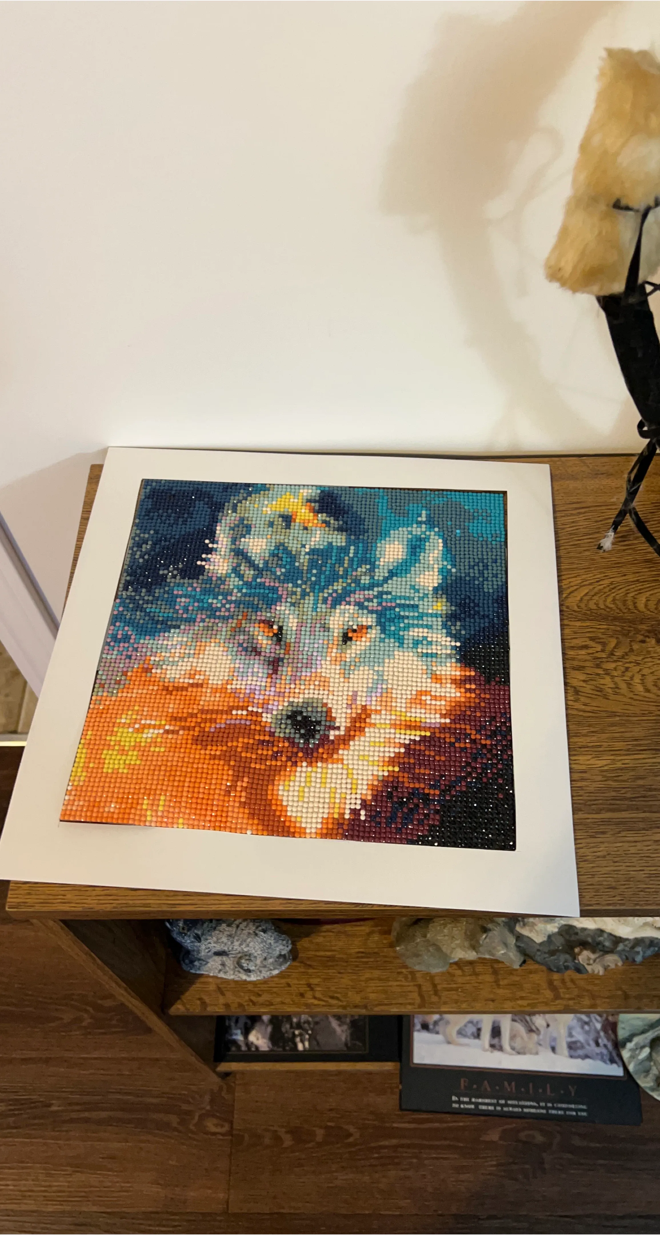 Here's a really cool diamond art painting of a wolf. It's got lots of blues, oranges, and blacks. It's framed in a white frame and ready to hang!