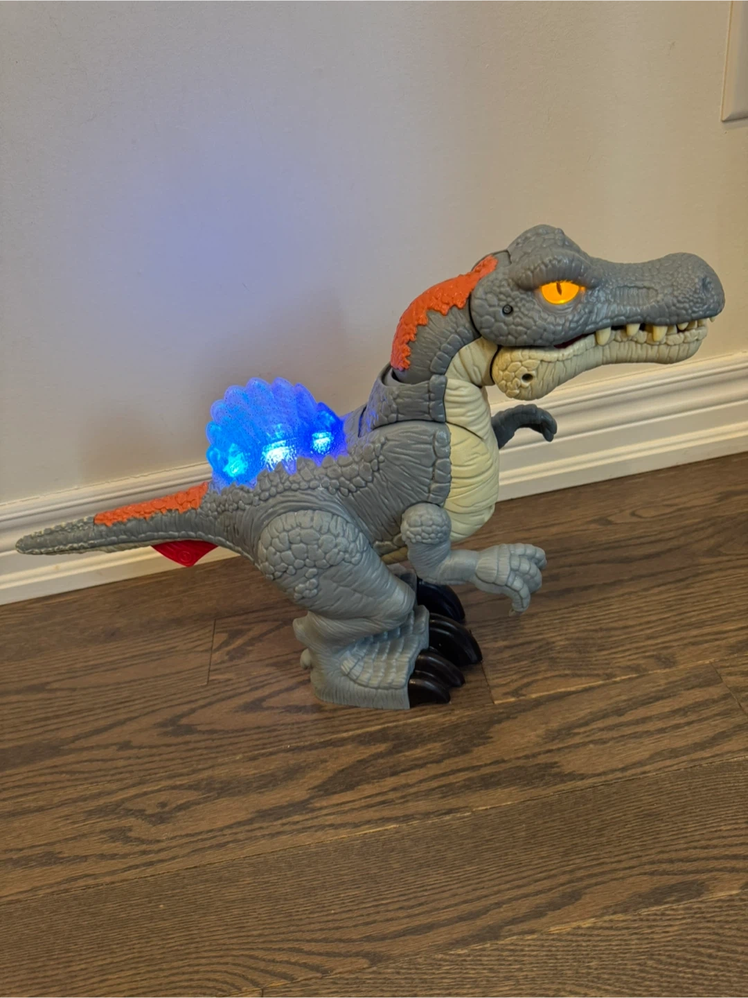 This is a grey and orange dinosaur toy with light-up features. It has yellow eyes that glow and blue lights on its back fin. The dinosaur's mouth opens and it has textured skin detail.