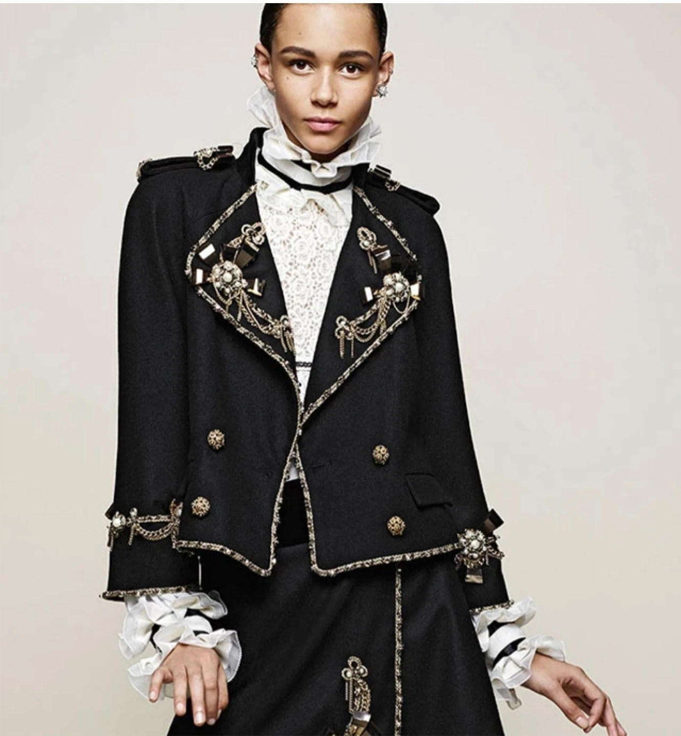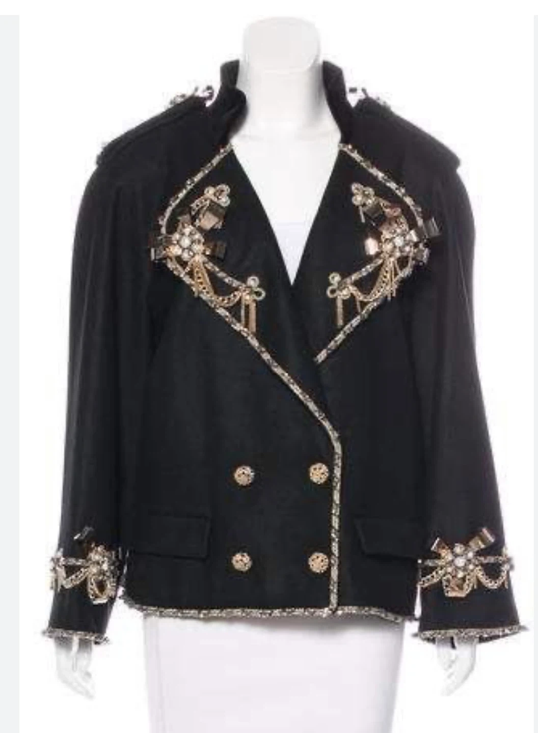 Selling a beautiful Chanel jacket in size 36. It's a stylish black jacket with unique embellishments and gold detailing. Perfect for adding a touch of elegance to any outfit!